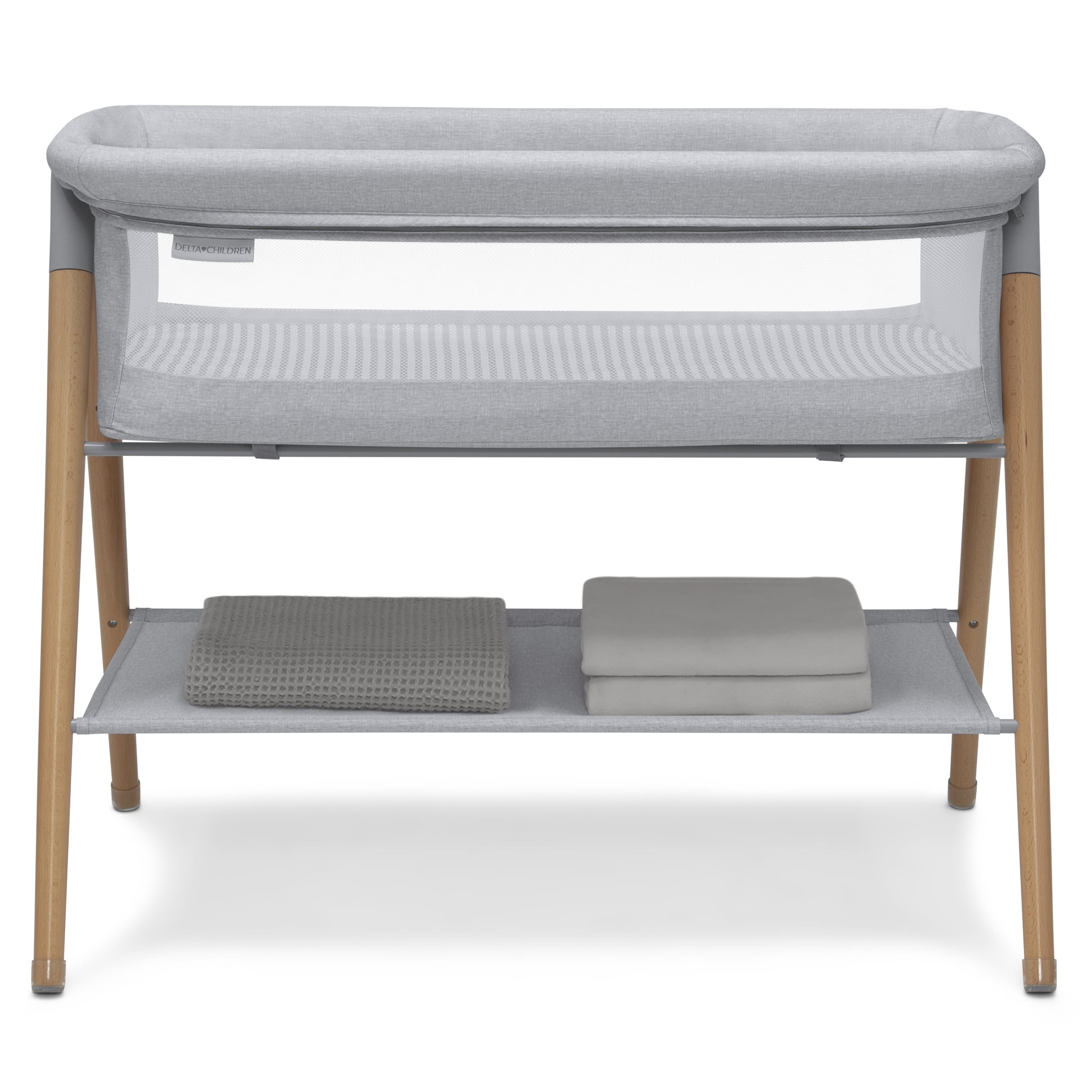 Delta Children Haven Beechwood by the Bed Bassinet with Breathable Mesh and Natural Beechwood Legs, Grey Stripe