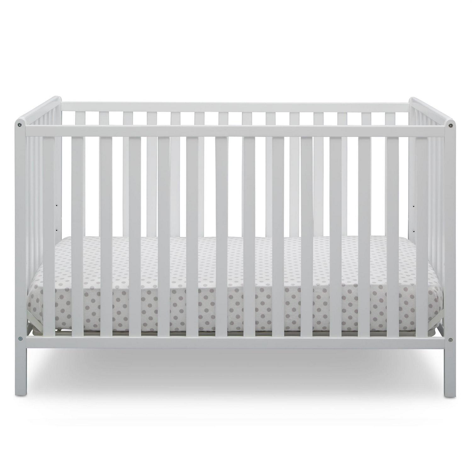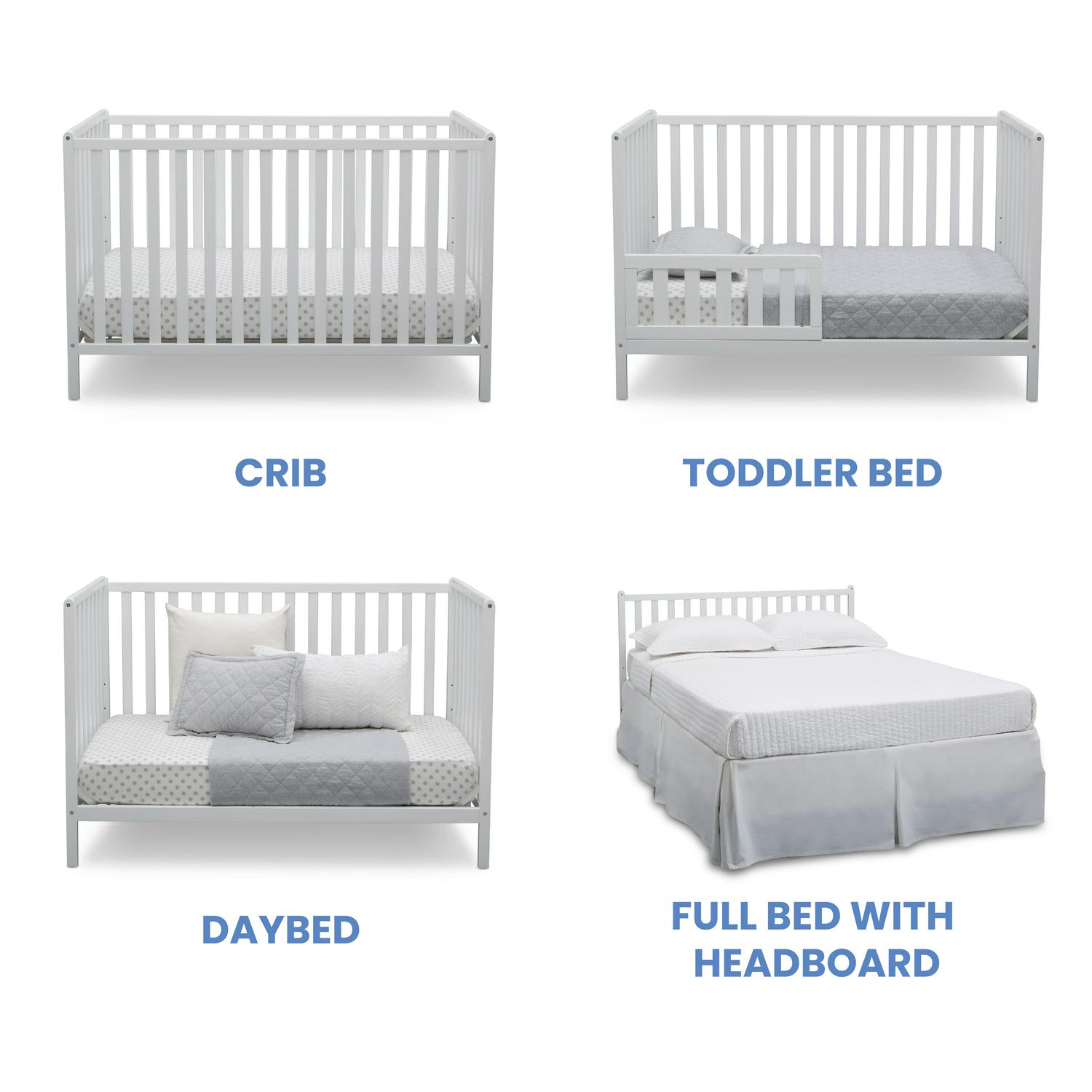 Simple and understated yet full of charm, the Heartland 4-in-1 convertible crib from Delta Children works in modern or traditional nurseries, so many possibilities with this versatile baby crib. Designed with clean lines and open and airy slats that provide a clear view to the baby, this crib is constructed from sturdy wood that stands up to years of use. A great value, the Heartland 4-in-1 crib features three mattress height positions, so you can lower the mattress height as your baby grows, plus it converts from a crib to a toddler bed, daybed, and full-size bed (daybed/toddler guardrail kit and full-size metal bed frame sold separately). Providing a safe and secure place for your child to sleep from birth till adulthood, this crib proves it’s as functional as it is fashionable. Punched up with bold and playful hues that add a lively twist on the timeless silhouette, the Heartland 4-in-1 crib from Delta Children makes it easy to create the nursery of your dreams. Available in multiple finishes.