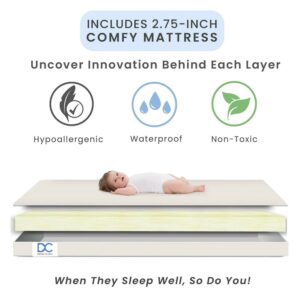 – INCLUDES MINI MATTRESS: Crib includes waterproof mini mattress that s the perfect fit | Mattress dimensions: 75″L x 24.50″ W x 2.75″H