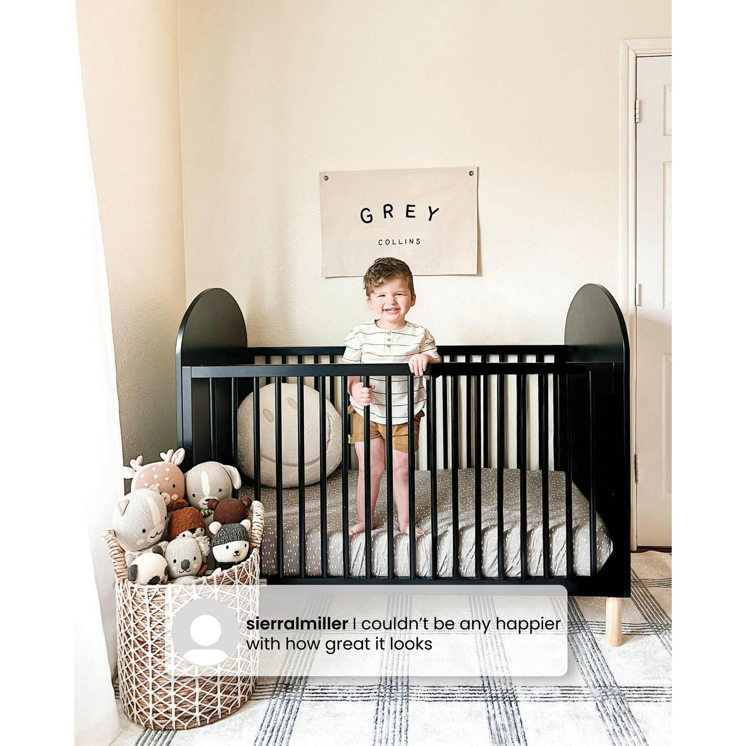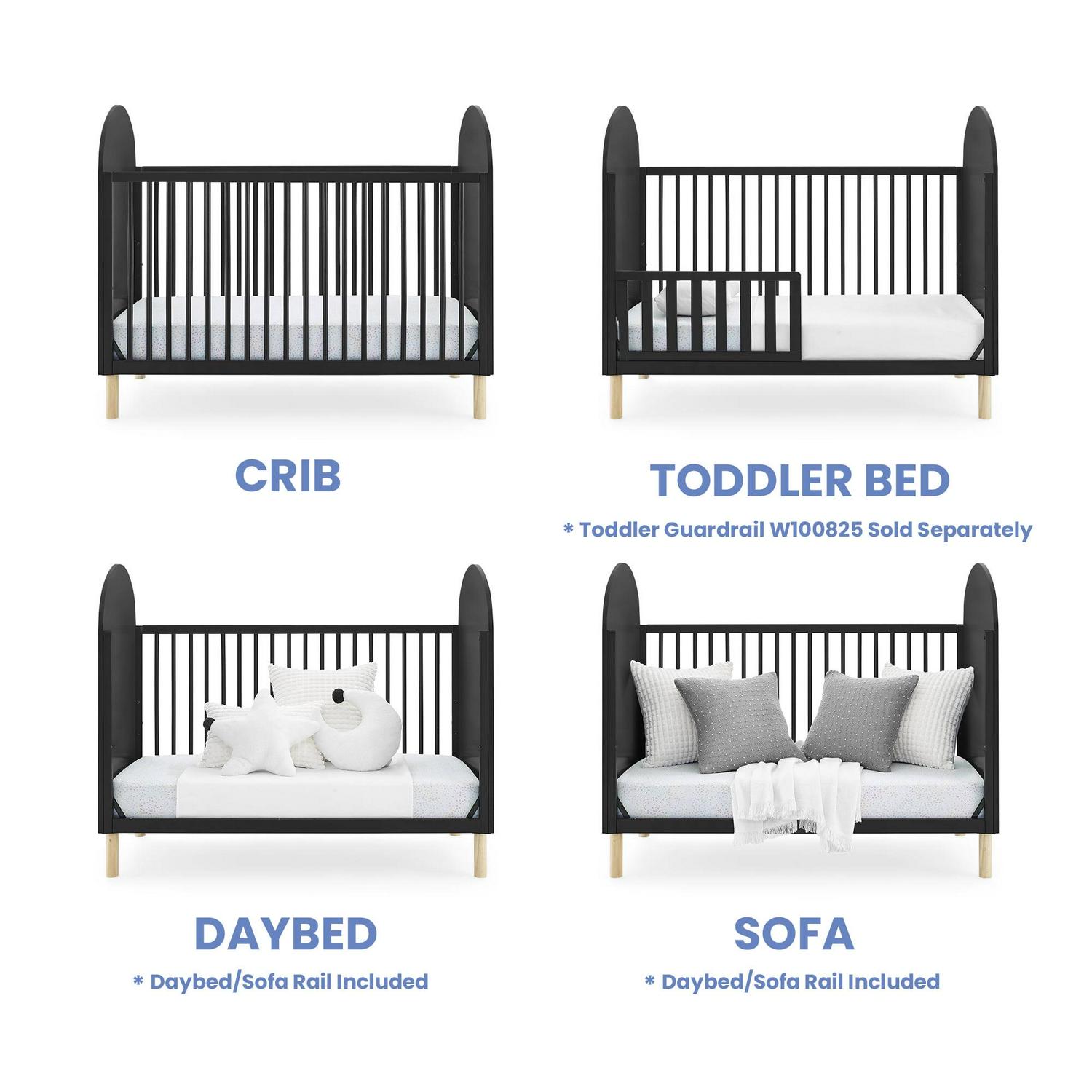 – 4-IN-1 CONVERTIBLE CRIB: Crib converts to a toddler bed, daybed and sofa (Daybed/Sofa Rail Included – Toddler Guardrail #W100825 in color #130 Bianca White or color #0011 Ebony sold separately) | Available in two-tone colors Bianca White, Ebony, Olive Green and Sedona, all with Natural colored feet