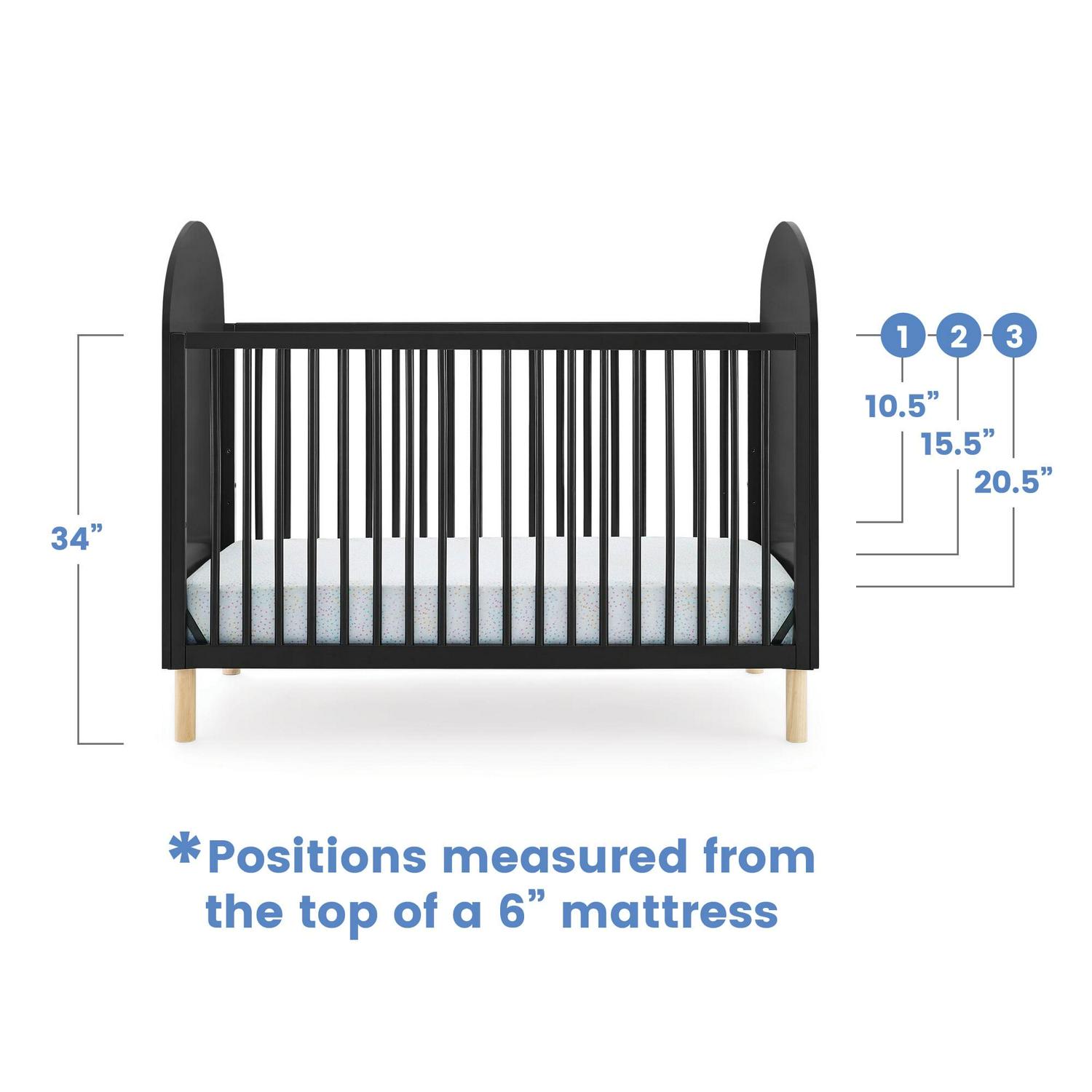 – ADJUSTABLE HEIGHT: Adjustable height mattress support with 3 convenient positions to grow with your baby | ACCESS RAIL DIMENSIONS: From Floor: 34.25″; From Top Mattress Support Position: 16.50″; From Bottom Mattress Support Position: 26.50″