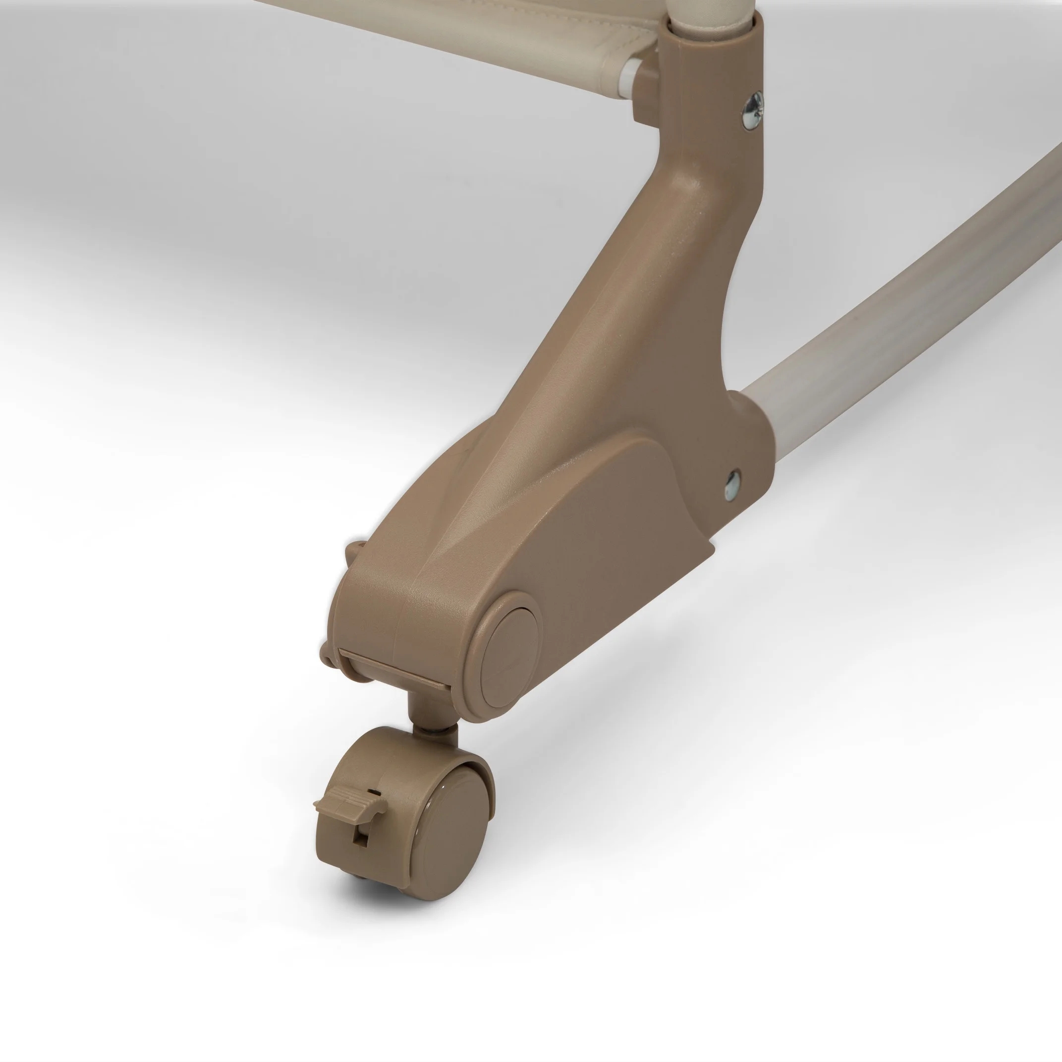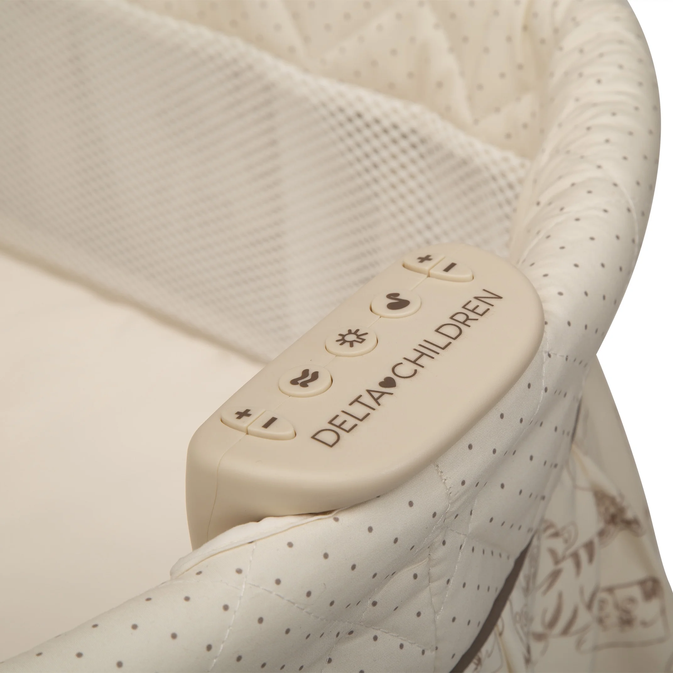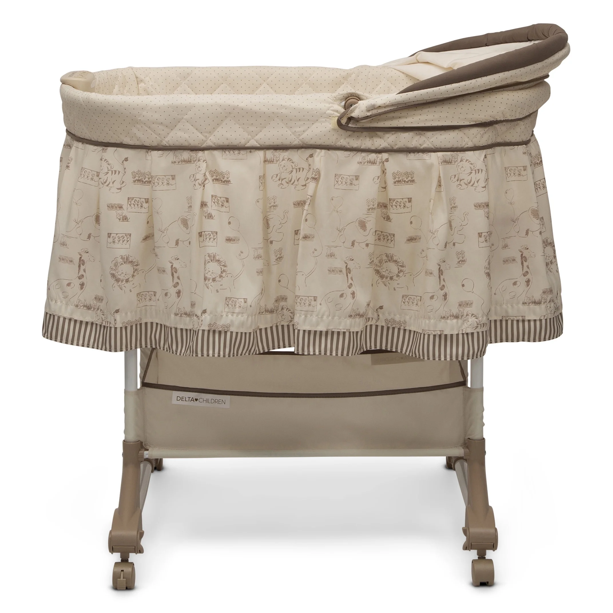 The adorable Rocking Bassinet by Delta Children is perfect for keeping your little one close to you during the early months. It features a jungle-inspired design theme with soft, neutral colors. As beautiful as it is practical, Delta Children’s Rocking Bassinet in Playtime Jungle features two plush toys hanging from the canopy and an electronic pod that will lull little ones to sleep with soothing music, gentle vibration, and a soft nightlight. Its rocking base adds another layer of comfort-activate the rocking motion with a gentle push. Wheels make it easy to move this beige baby rocking bassinet from room to room. A large mesh storage basket provides ample space to store all your baby essentials. This Delta baby bassinet comes with a mattress pad and matching sheet.
