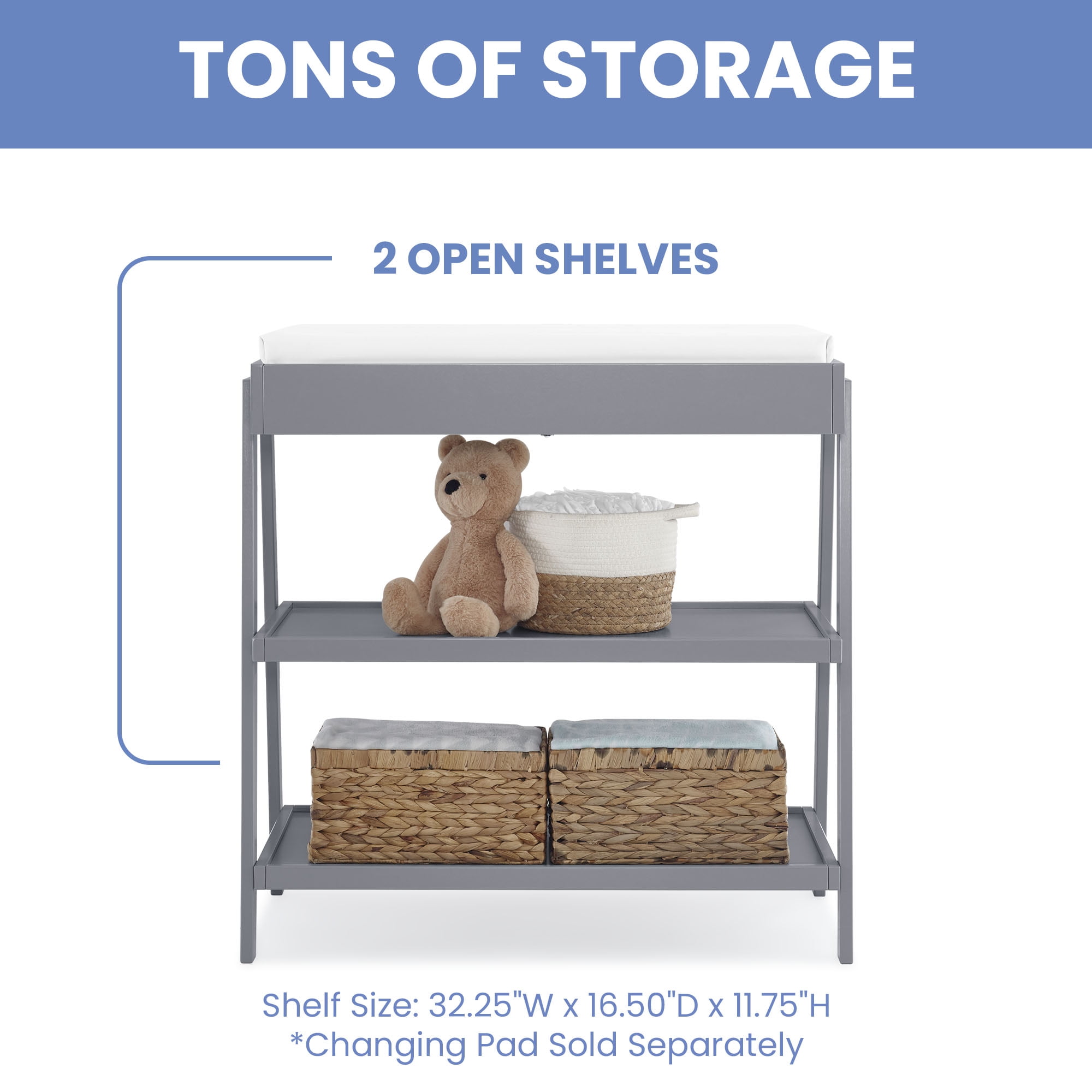 The Scout Changing Table by Delta Children is a must-have for your nursery. The contemporary design of this changing table goes with any style. Crafted with two open shelves, this changing table makes it easy to store (and grab) diapers, wipes and other essentials. A standout piece for years to come, this changing table can also be used as a storage piece or bar cart later on. Plus, this changing table is GREENGUARD Gold Certified, which means it’s built to contribute to cleaner air for a healthy home. Pair this changing table any Delta Children crib in the same finish for a complete nursery. Changing pad sold separately.