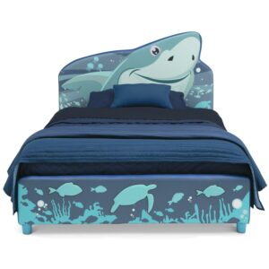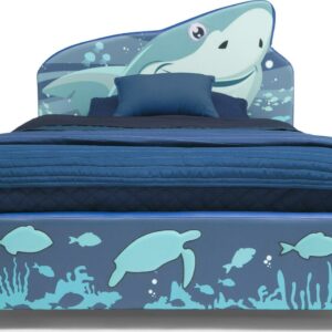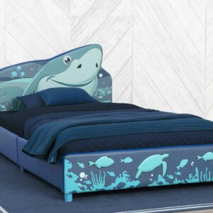 This Shark Upholstered Twin Bed by Delta Children allows kids to swim (or sleep) with the sharks. A great choice for ocean lovers, it features a big shark on the headboard and three-dimensional sea creatures on the footboard. Fully upholstered in faux leather with a sturdy and durable hardwood frame, this kids’ bed creates a magical and safe sleep space that will inspire underwater adventures. No box spring required. Mattress not included.