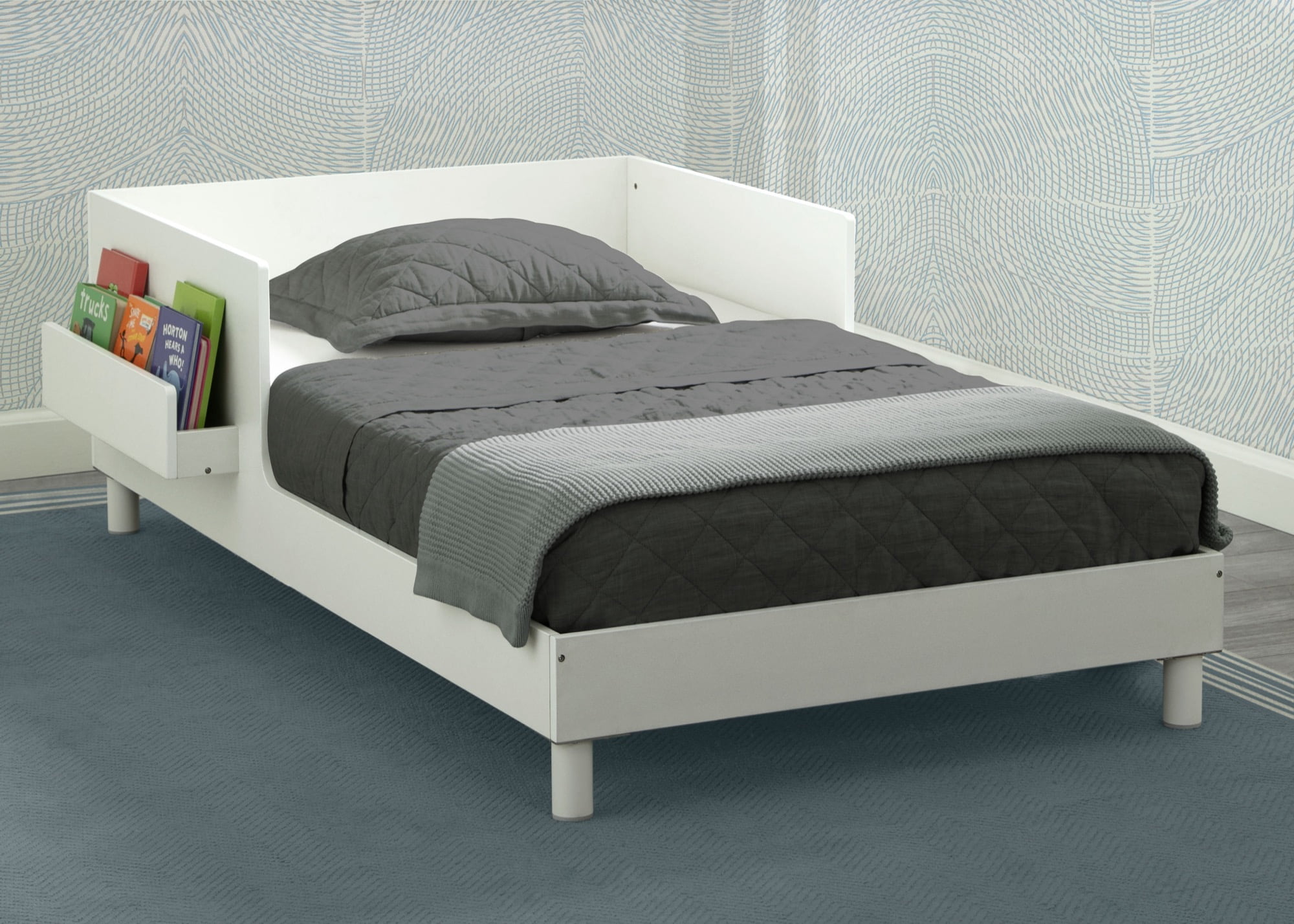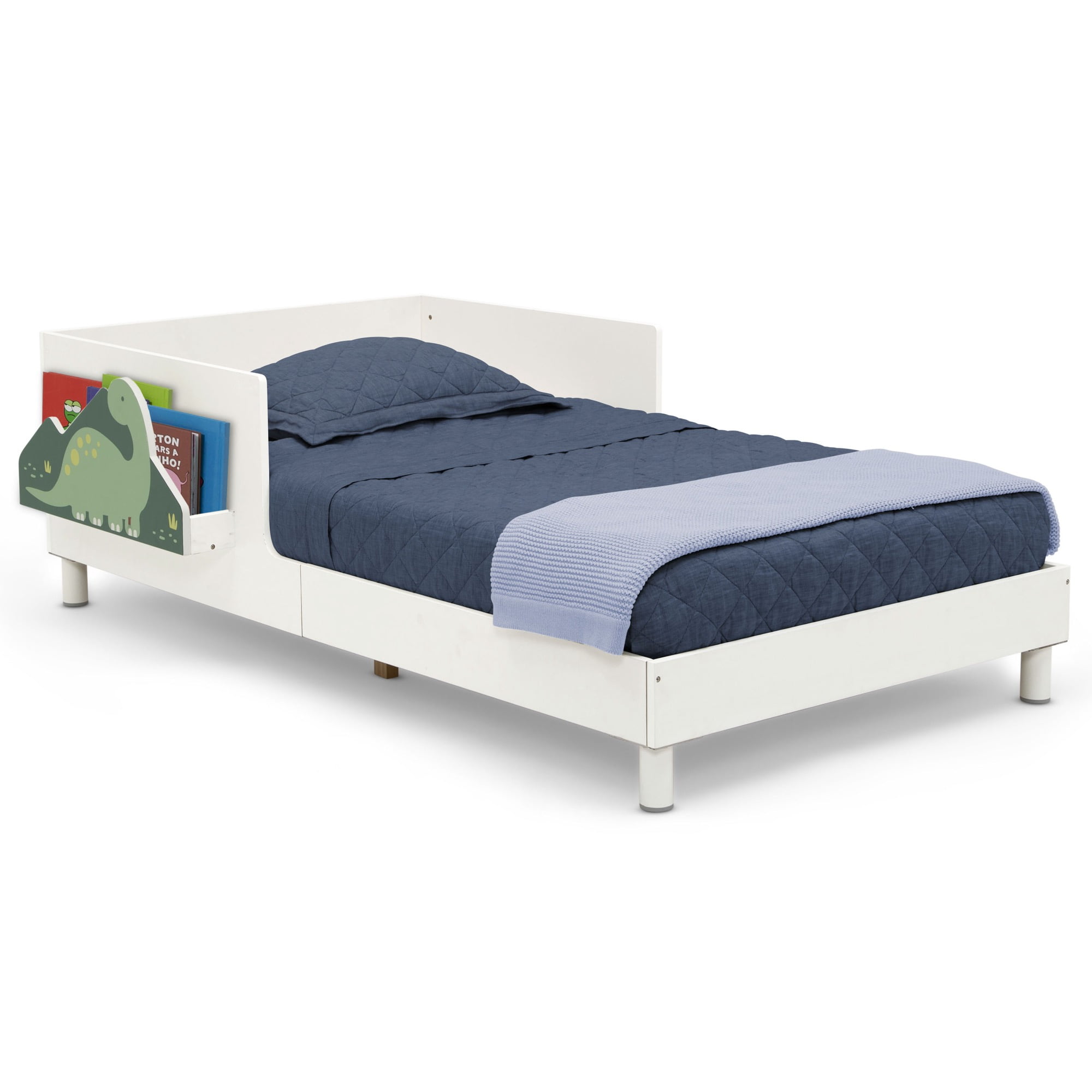 Create the coziest space with the Sleep N Store Toddler Bed by Delta Children. Its sleek details give your toddler’s bedroom an instant update, and its two attached guardrails and low height make it a safe choice for your growing child. The interchangeable bookshelf on one side offers kids essential storage and three cool options—choose from a rainbow shelf, dinosaur shelf or white shelf. Also included with this versatile toddler bed are permanent rainbow and dinosaur themed stickers that can be used to decorate the headboard. The perfect mix of style and storage, the Sleep N Store Toddler Bed by Delta Children is the ideal option for your little one. Mattress not included.