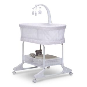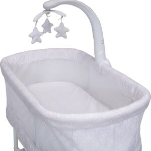 The SleepCool Rocking Bassinet by Delta Children has everything your baby needs to peacefully drift off to dreamland. The soothing rocking motion is activated by a gentle push while the breathable mesh sides allow air flow and visibility. And as your little one relaxes on the comfy mattress pad, they can look up at the mesmerizing overhead mobile with rotating plush stars. The mobile arm also features vibration, music, nature sounds, nightlight and twinkle lights. A dream come true for new parents, this bedside sleeper includes a machine washable bassinet sheet, large storage basket that keeps essentials close and wheels that make it easy to move. The modern pattern ensures this bassinet flawlessly coordinates with any décor. This bassinet is recommended for babies 0-5 months. Max weight 30 lbs. Stop use at 5 months or once your infant begins to push up on their hands and knees, whichever comes first.