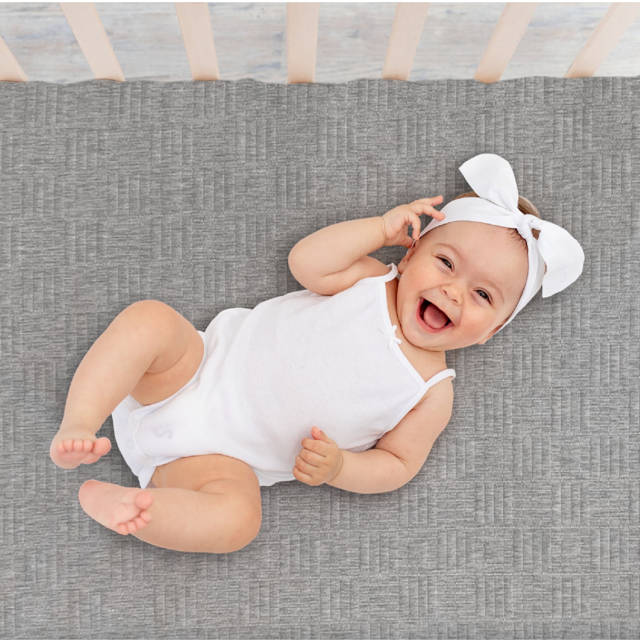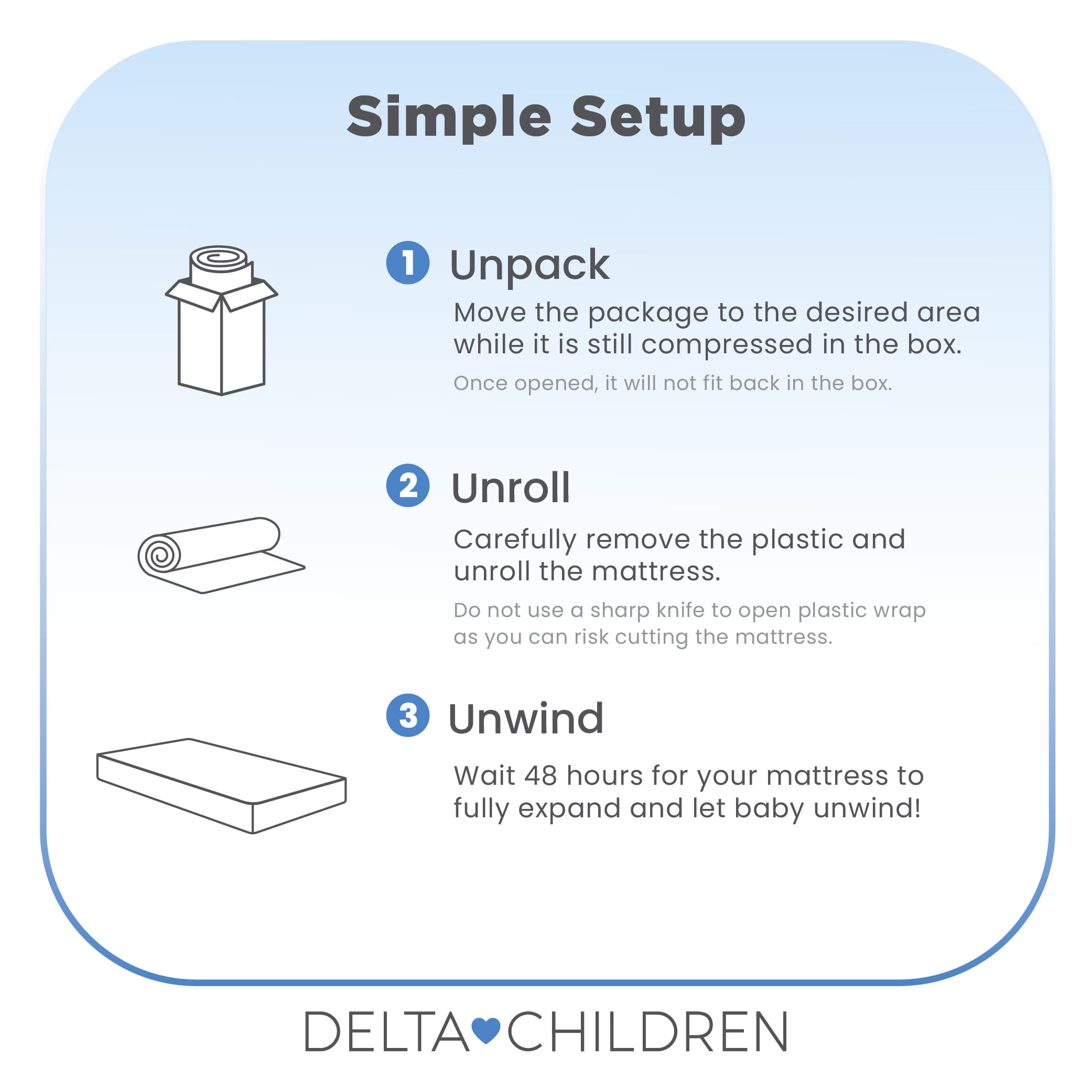 Unroll a good night’s sleep with the Sweet Beginnings Dual Sided Baby Crib Mattress and Toddler Mattress by Delta Children. Made with a soft, knit cover with waterproof backing and plant-based soy foam core, this baby mattress provides exceptional comfort as well as the ideal firmness level to support growth and development. Both sides of this mattress feature the waterproof backing, so all you need to do is flip the mattress when it comes time for your baby to move from the crib to a toddler bed—it’s specifically designed to fit any standard full-size crib and toddler bed. This compressed baby mattress is shipped in a lightweight box that’s delivered safe and fast to your door—no need to go to the store! For optimal performance, open and unroll your mattress within 2 weeks of purchase. Once unpacked and fully expanded, zip the cover up. The cover is not intended to be removed and is not washable. Mattress may take up 48 hours to fully expand.. A healthy and safe choice for your baby, all Delta Children crib mattresses are GREENGUARD Gold Certified and meet the strictest standards offered by the Greenguard Environmental Institute, which recognizes products with low chemical emissions, contributing to improved indoor air quality in your home.