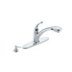 Equip your kitchen with the cutting-edge efficiency of the Delta Faucet 470-PROMO-DST Single Handle Pull Out Kitchen Faucet with Side Spray. This kitchen faucet features a pull-out spout as well as a uniquely designed side sprayer. It’s durably constructed from metal with a versatile chrome finish. A single lever handle lets you adjust water temperature easily on this faucet that requires three-hole sink installation.