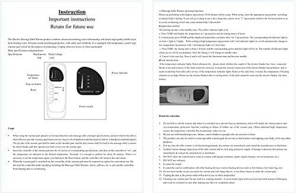 For Use with Massage Tables Only, Do Not Use as a Bed Blanket Warmer due to risk of Fire and/or Death. Please read manual and contact seller/manufacturer if you have any questions or concerns. The product should only be used as a massage table warmer, do not use if for any other purpose! It is not safe to use this product as a sleeping heating blanket in your bed! Check power cord, controller, blanket and power supply for any worn, damaged or defects prior to use. If damage is detected, discontinue use immediately and consult the manufacturer or distributor. Product Specs Rated Power 70W, Rated Voltage 110V – 60Hz, use only with corresponding outlets. 1) Read owner?s manual before operating 2) Table Warmer must be unfolded completely while in use. Do not allow it to become bunched or folded over as this could cause excess heat, resulting in injury or fire. 3) Do not pierce with sharp object. 4) Never use if wet. Do not allow the control unit or power cord to come into contact with liquids. 5) Unplug when not in use or unattended. 6) This product is NOT a blanket. It is intended for use ONLY as a massage table warmer. 7) Do not machine wash, dry or iron. It can be hand wiped with wet towel and small amount of detergent, and it can be switched on only after making sure that it is completely dried. 8) Never leave disabled person, infants or small children unattended while in use. The Therapist?s Choice Fleece Massage Table Warmer provides the most luxurious massage experience available to your clients. Specific details include 5 adjustable heat settings, auto over-heat protection-When set to higher temperature, it will reset to low temp(1 red light) after about 45 minutes of use-Just reset to high if needed. This is a safety feature. Elastic corner straps and an extra long 12 foot plus power cord. Reaches about 88 degree F. 90 Day Limited Warranty, Contact seller if you need tech support or return issues.