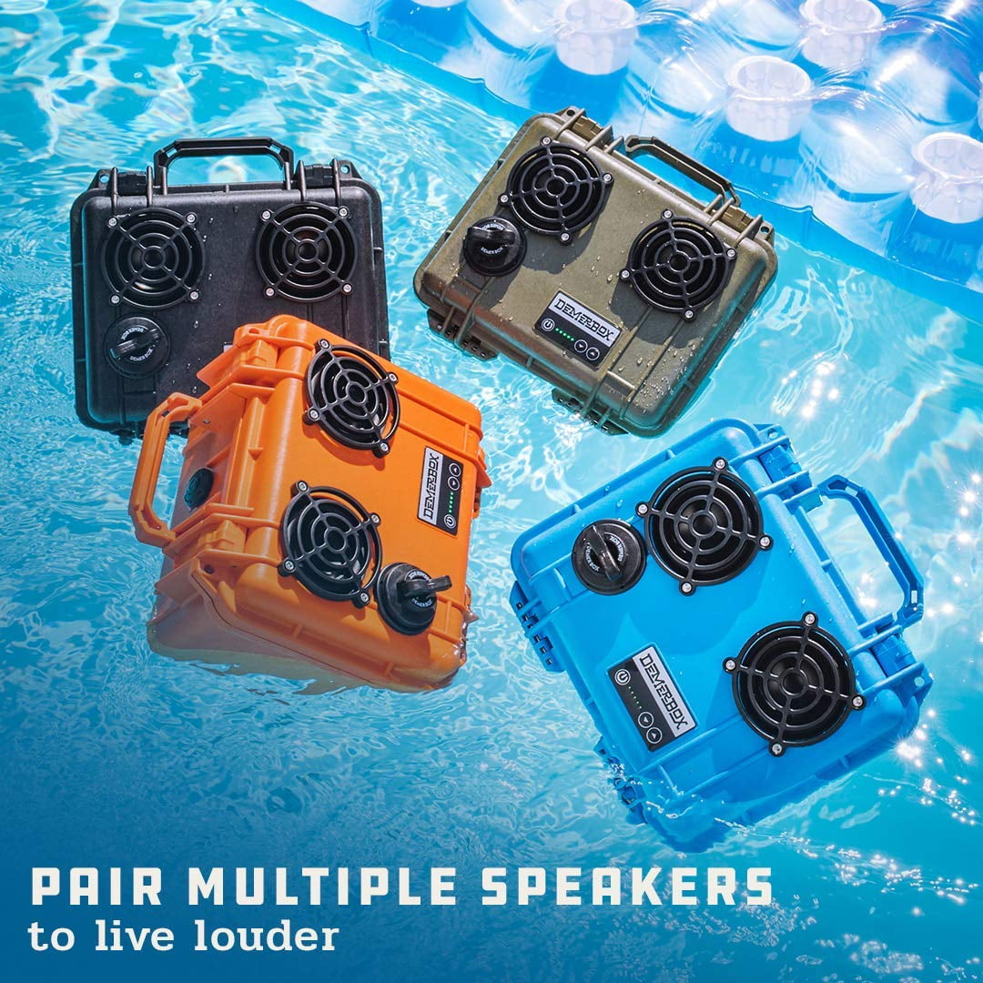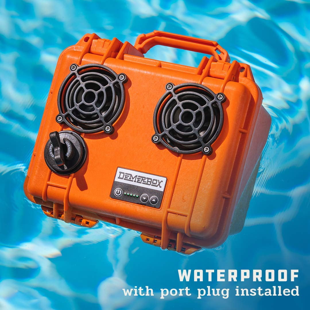 Introducing DemerBox DB2-a dual speaker with unmatched sound quality, clear audio and powerful bass, now with multiple Bluetooth speaker pairing. One DemerBox is plenty to get the party started, but pair multiple. DemerBox speakers to create an outdoor sound system at your next summer pool party. Up to (6) six DemerBox speakers can be paired together / multiple Bluetooth Speaker Pairing will not work with the original DemerBox. Incredibly Loud, Clear Sound, Powerful Bass: With crisp highs and punchy bass our professional-grade sound excels, providing the soundtrack loud enough for your outdoor adventures. Includes a Port Plug that installs quickly to become fully waterproof. Never worry about rain at your backyard party or the speaker falling overboard again. DemerBox is a waterproof case that opens to keep valuable items like your wallet, keys and phone safe and dry inside. Built in a crush-proof Pelican case, DemerBox lasts an incredible 40 hours between charges. Plus, it has internal USB charging to keep your devices juiced up for your entire adventure! You don’t like adding to landfills and neither do we. That’s why we built a fully serviceable speaker designed with sustainability in mind. In the unlikely event that there’s an issue, DemerBox can fix it. Each DemerBox is hand built in the USA and was developed from extensive durability tests on every continent and environment imaginable. Wherever you go, DemerBox has been there! DemerBox’s compact size and light weight makes it easy to take anywhere. Each DemerBox includes an AC charger, 3.5mm aux cable and Port Plug.