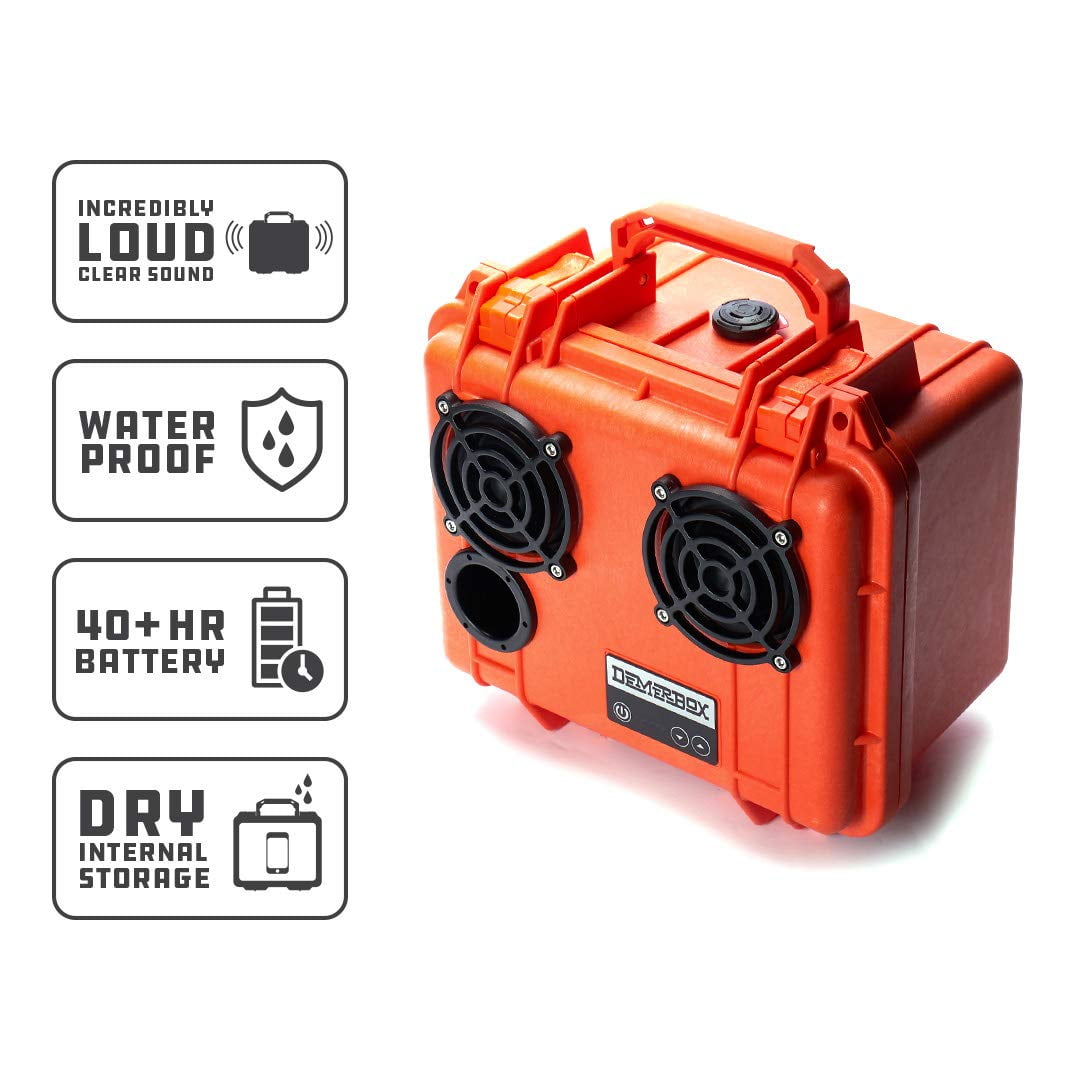 Waterproof: Includes a Port Plug that installs quickly to become fully waterproof. Never worry about rain at your backyard party or the speaker falling overboard again! Stores Your Stuff A Crushproof Powerhouse: Built in a crush-proof Pelican case, DemerBox lasts an incredible 40 hours battery. Plus, it has internal USB charging to keep your devices juiced up for your entire adventure! Built to Last: You don’t like adding to landfills and neither do we. That’s why we built a fully serviceable speaker designed with sustainability in mind. In the unlikely event that there’s an issue, DemerBox can fix it Globally tested: Each DemerBox is hand built in the USA with domestic and globally sourced parts and was developed from extensive durability tests on every continent and environment imaginable. Wherever you go, DemerBox has been there! Portable: DemerBox’s compact size and light weight makes it easy to take anywhere. Size: 10.62” x 9.68” x 6.87” (27 x 25 x 18 cm); Weight: 5.44 lbs. (3.37 kg)