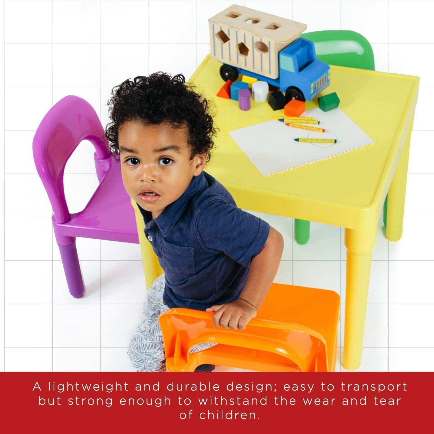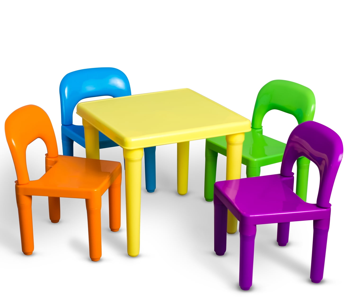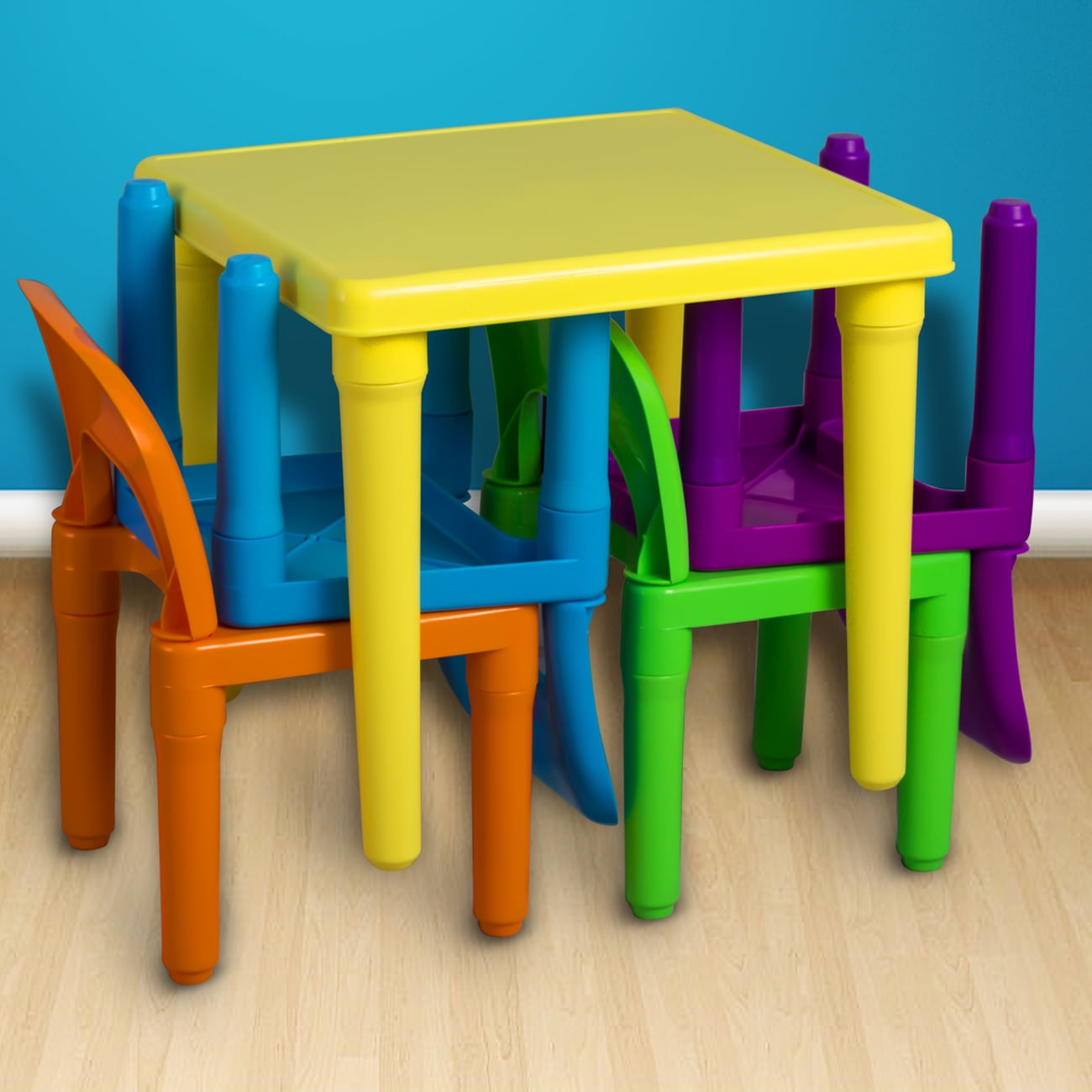 Den Haven | Kids Table and Chairs Play Set Colorful Child Toy Activity Desk for Toddler | Encourage your child’s creativity and learning with this durable, colorful table and chair set from Den Haven. Crafted from sturdy, water-resistant plastic, the set is easy to clean and assemble without tools. The vibrant orange, green, blue, and purple chairs, paired with a yellow table, provide a fun and engaging space for your little one to play, eat, or work on their studies. Suitable for ages 3 and up, this versatile set is perfect for classrooms, playrooms, daycares, and kids’ rooms, offering a safe and comfortable environment for your child to explore and grow. Product details: Four (4) stackable chairs One (1) table Water-resistant BPA-free plastic. East to Assemble