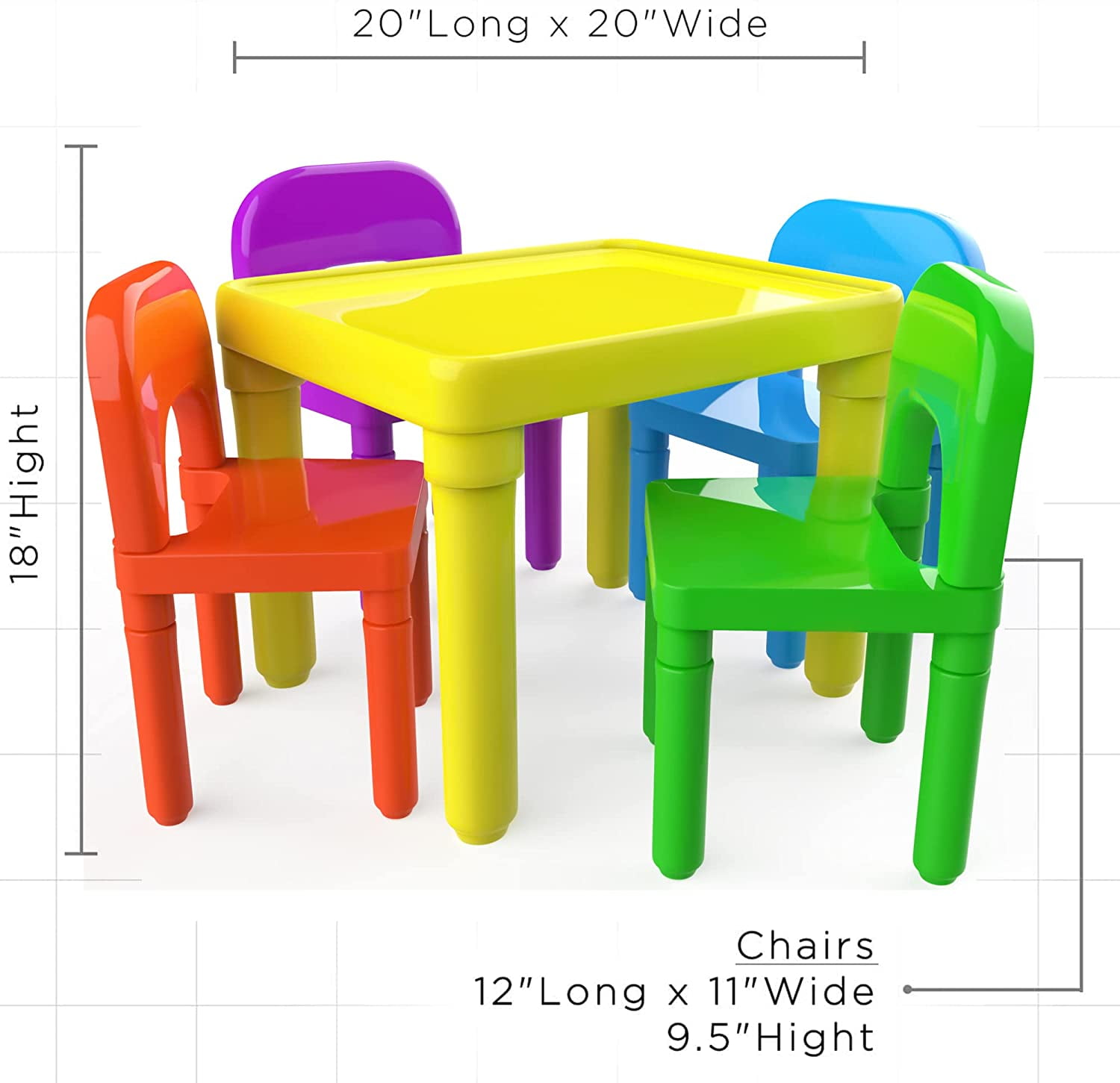Durable, water-resistant plastic construction that is built to withstand wear and tear from children ages 3 and up. Easy-to-clean surface that won’t leave marks on walls or floors, making it a breeze to maintain. Fast and tool-free assembly, allowing you to set up the table and chairs in a snap. Space-saving design that can be quickly disassembled for easy storage, perfect for playrooms, classrooms, and kids’ rooms. Vibrant color scheme with orange, green, blue, and purple chairs, and a yellow table, creating a fun and engaging environment for your little ones. Dimensions: table – 20 x 20 x 17 inches, chairs – 12 x 11 x 18 inches, suitable for a variety of settings, from classrooms to daycares. BPA-free plastic construction ensures a safe and non-toxic play area for your children.