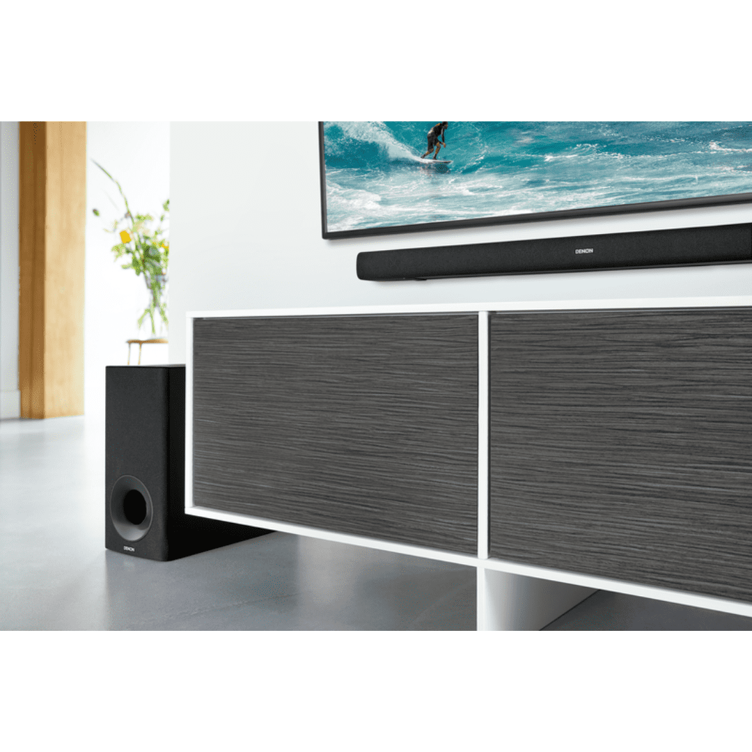 LET YOUR TV COME TO LIFE – Equipped with dual 1.25″ x 4.4″ mid-range drivers, detailed crisp 1″ tweeters and Dolby DTS, you will IMMERSE YOURSELF IN VIRTUAL SURROUND SOUND AT HOME WITH THEATER-QUALITY AUDIO DEEP POWERFUL BASS – Give your favorite movies, music and shows the deep, rich bass they deserve. No unsightly tangled wires or cables. Just place the included wireless subwoofer anywhere in the room and let the whole place rumble HEAR EVERY WORD WITH DIALOGUE ENHANCER – Denon brings to you an intelligent way of enhancing dialogues that makes them sound crystal clear without having to adjust the volume. Even the most complex audio tracks will now be loud and clear LOW PROFILE DESIGN THAT FITS MOST SPACES – At just under 2″ tall, the sound bar fits below the TV allowing uninterrupted viewing and won’t block the IR remote sensor. Place it on a shelf or wall-mount it using the included mounting template