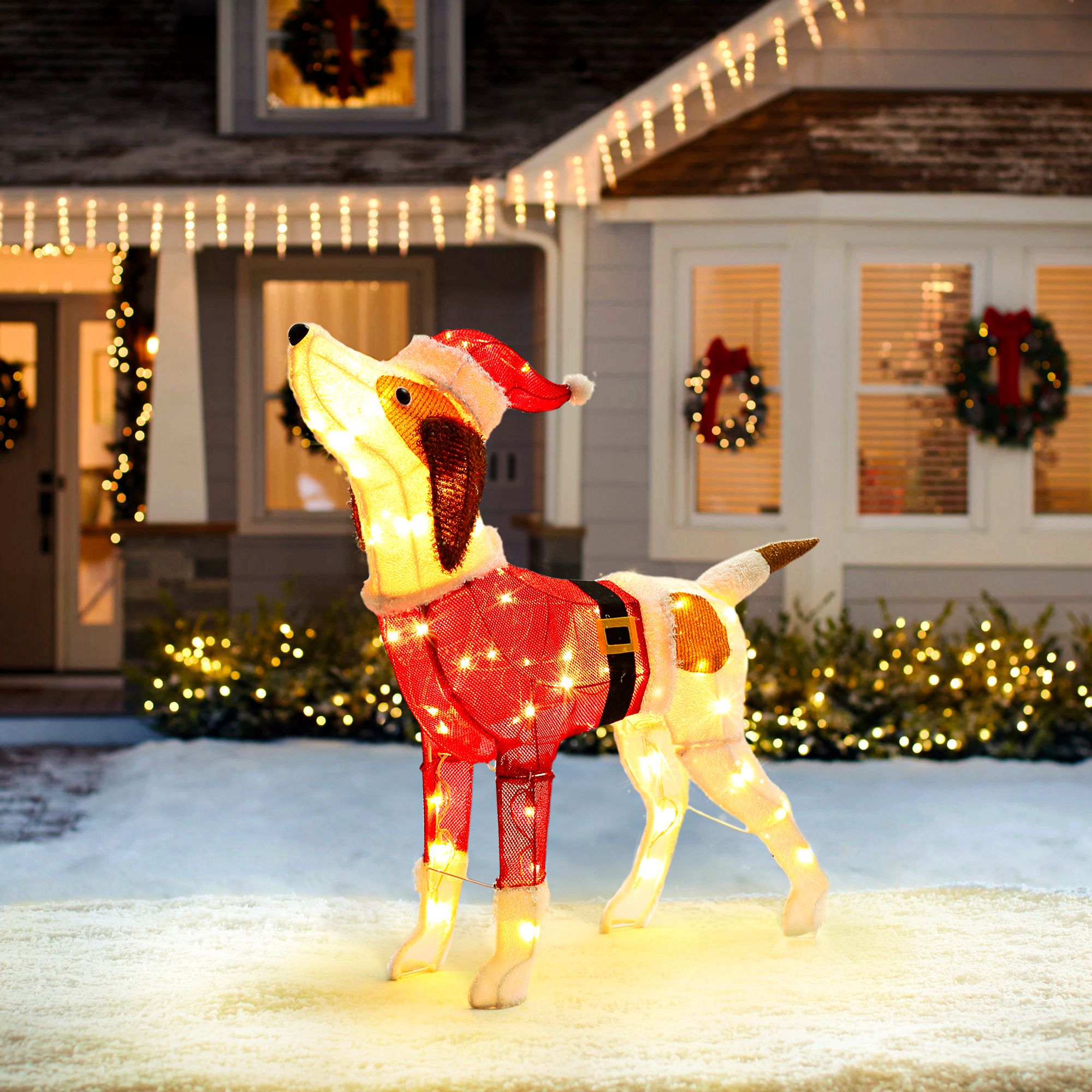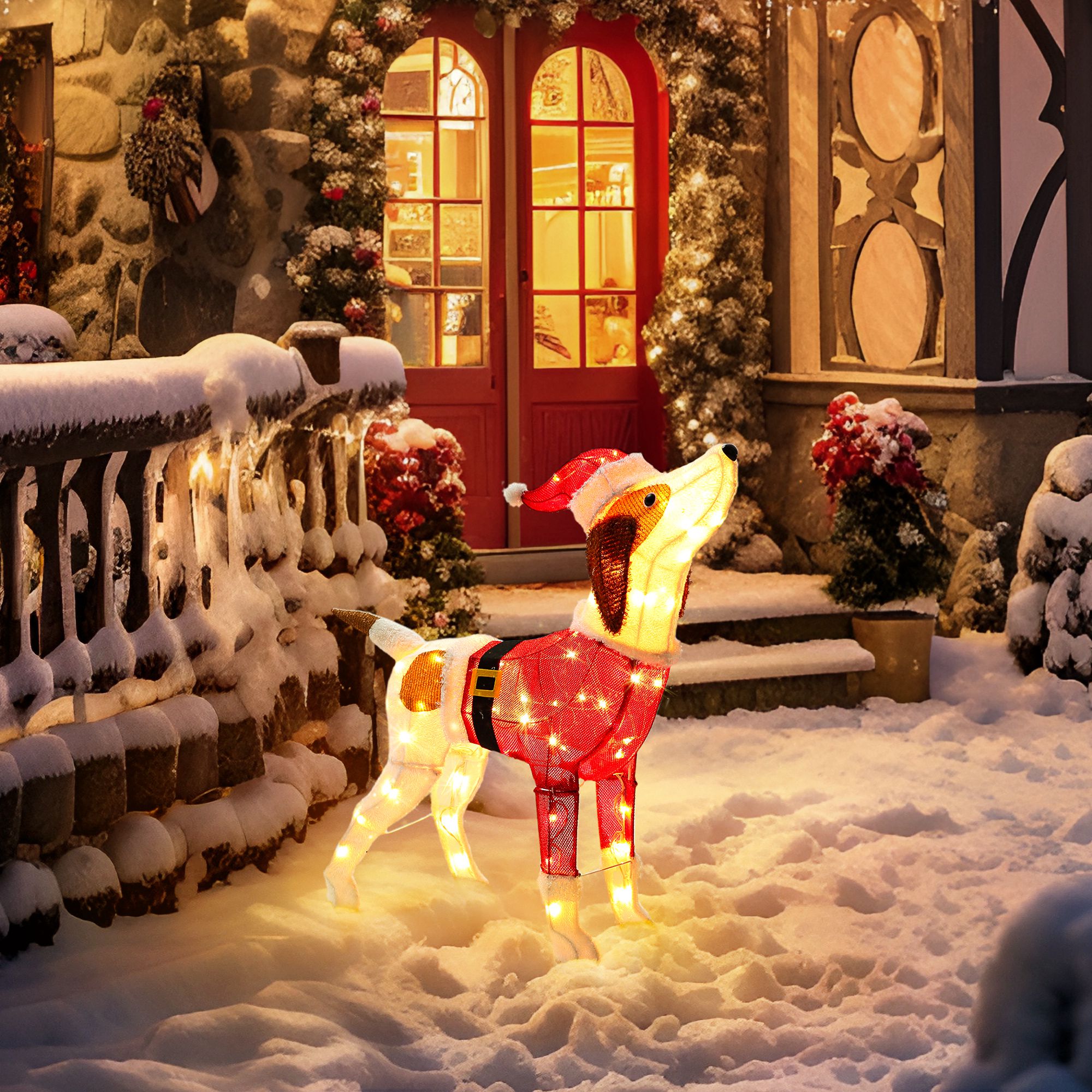 【ADORABLE DESIGN】: Featuring a cute dog, this decoration captures the joy and playfulness of winter sports, this lighted dog will add to your Christmas decorations and light up every moment of the holiday season. 【EASY SETUP】: Simple to assemble and display, allowing you to quickly add festive charm to your home, garden, or yard. Overall dimensions of 28 inches x 9 inches x 29.5 inches (L x W x H), perfectly blends into a variety of environments. 【VERSATILE DECOR】: Perfect for holiday decorations, garden lighting, or adding a touch of charm to your living space year-round. It will create cherished memories for you and your family and friends, and create a unique holiday atmosphere in a variety of occasions. 【ENERGY EFFICIENT】: Low-energy LED lights provide brilliant illumination without high power consumption,low-energy design is not only environmentally friendly but also extends the service life. Gentle, warm white LED lights provide a cozy glow, perfect for both indoor and outdoor use. 【DURABLE CONSTRUCTION】: Made from high-quality, weather-resistant materials to withstand winter elements and ensure long-lasting enjoyment.We provide excellent customer service to ensure that you have the best experience.