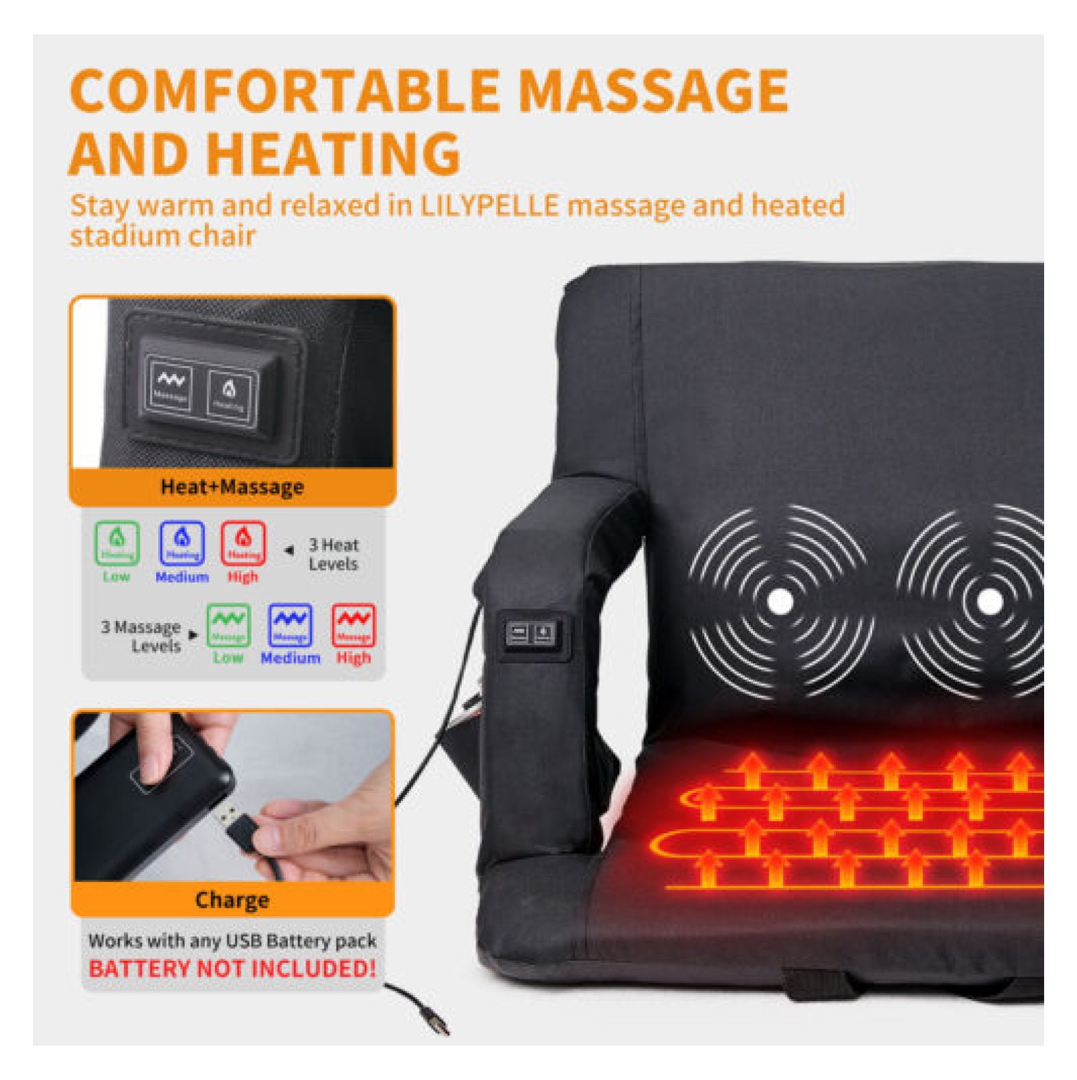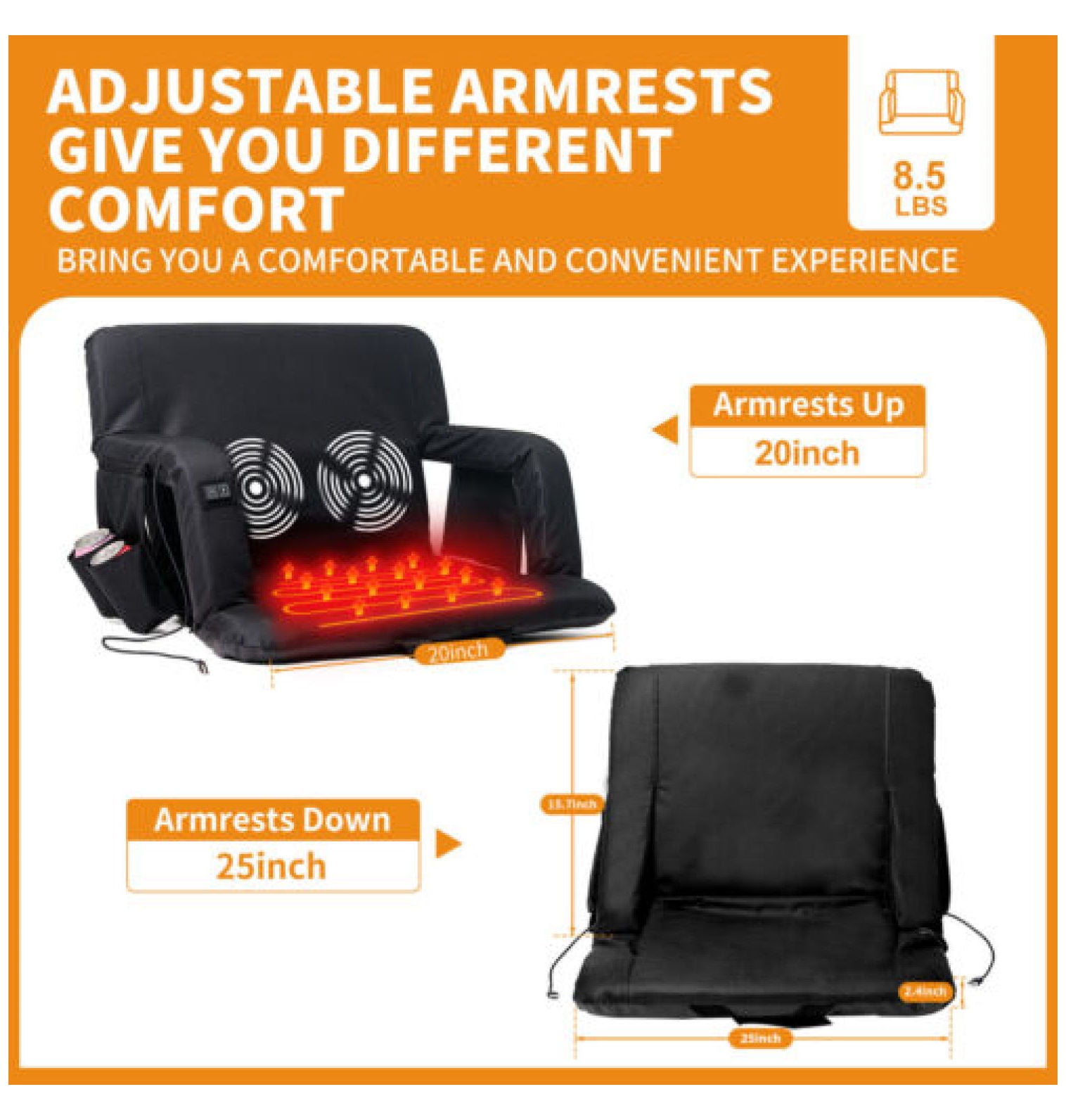 Welcome to our store specializing in household goods! Step into a world where functionality meets style, and discover an array of products designed to enhance every corner of your home. From cozy living room essentials to practical kitchen gadgets and elegant decor pieces, we have everything you need to create your dream living space. Feel free to explore our curated selection, and don’t hesitate to ask if you need any assistance. Happy shopping! 1. Type:Heated Massage Stadium Seat.Color:Black.Seat Material:Polyester 2. Item Width:21 inch/25 inch.Suitable For:Backpacking,Hiking,Indoor/Outdoor.Features:Adjustable Backrest,Portable,Foldable,Side Pockets,Padded,Quick-Drying,Breathable 3. Weight Capacity:21 inch for less 160 lbs / 25 inch for heavier buyer.Item Weight:7.4 lbs/8.5lbs
