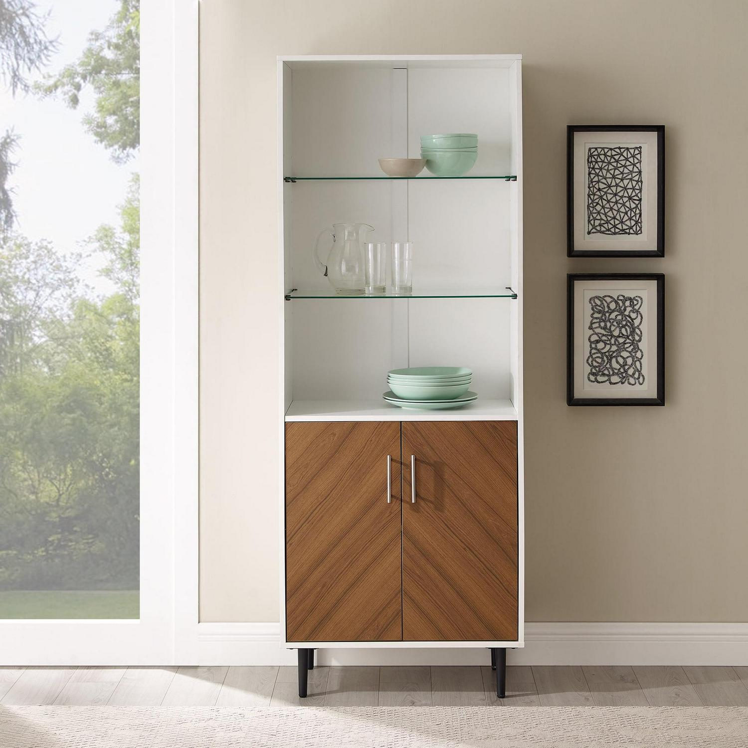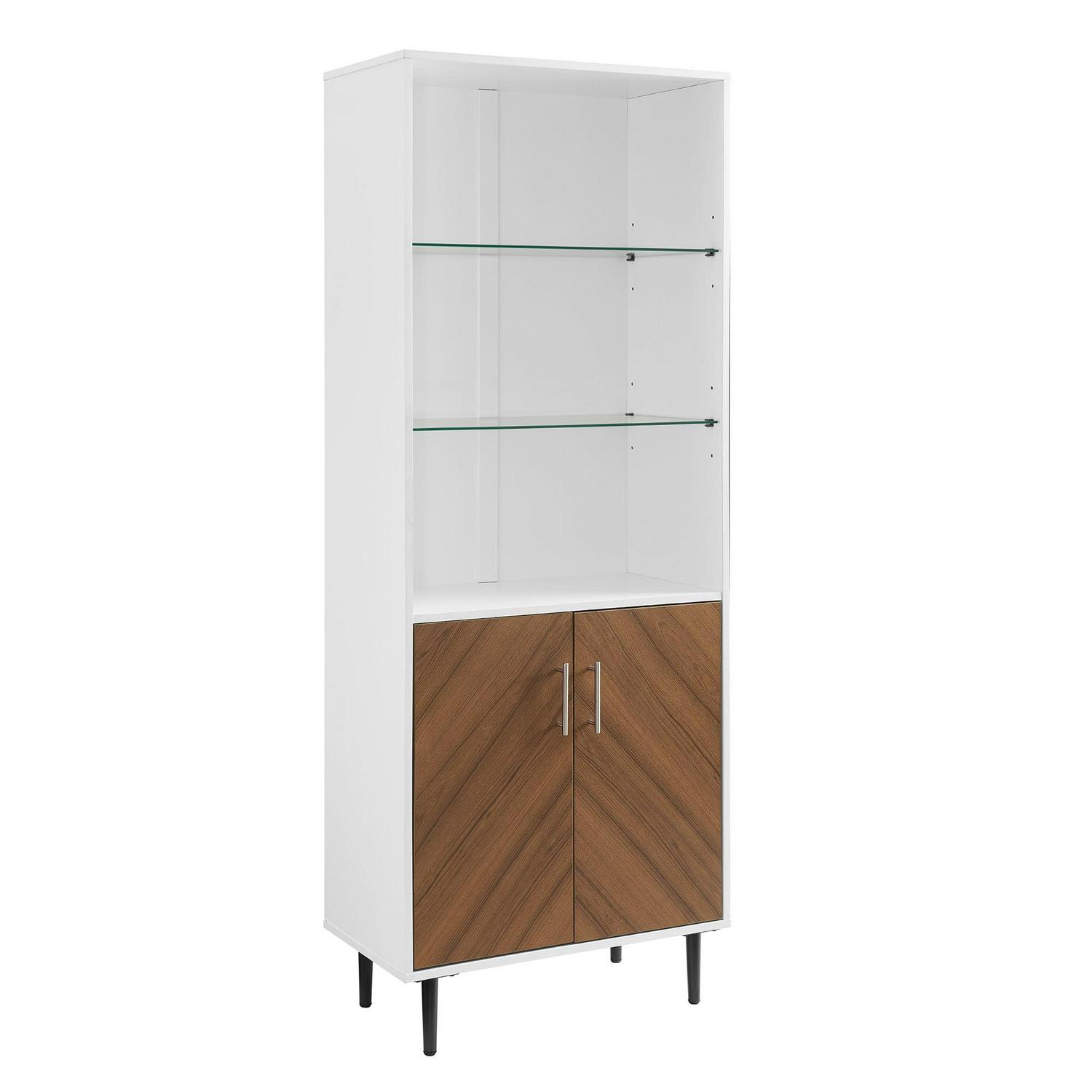 Bring soft notes of mid-century style to your home with the Desert Fields 2-Door Bookmatch Dining Storage Cabinet with Hutch. The faux bookmatch doors will stand out with their bold pattern and powder-covered metal handles. Angled metal feet add to the throwback feel of the piece. One adjustable wood shelf creates closed storage space for hidden clutter. Show off your best china, books, or houseplants on the glass adjustable open storage shelves. This cabinet will become the staple of your living room, kitchen, or wherever else you need extra organization. Add sophistication and style to your space with the Desert Fields 2-Door Bookmatch Dining Storage Cabinet with Hutch.