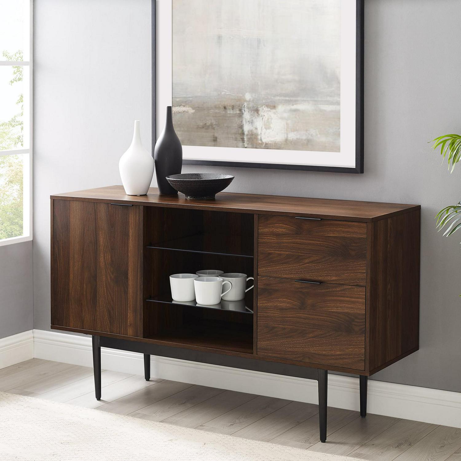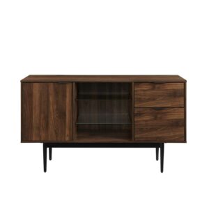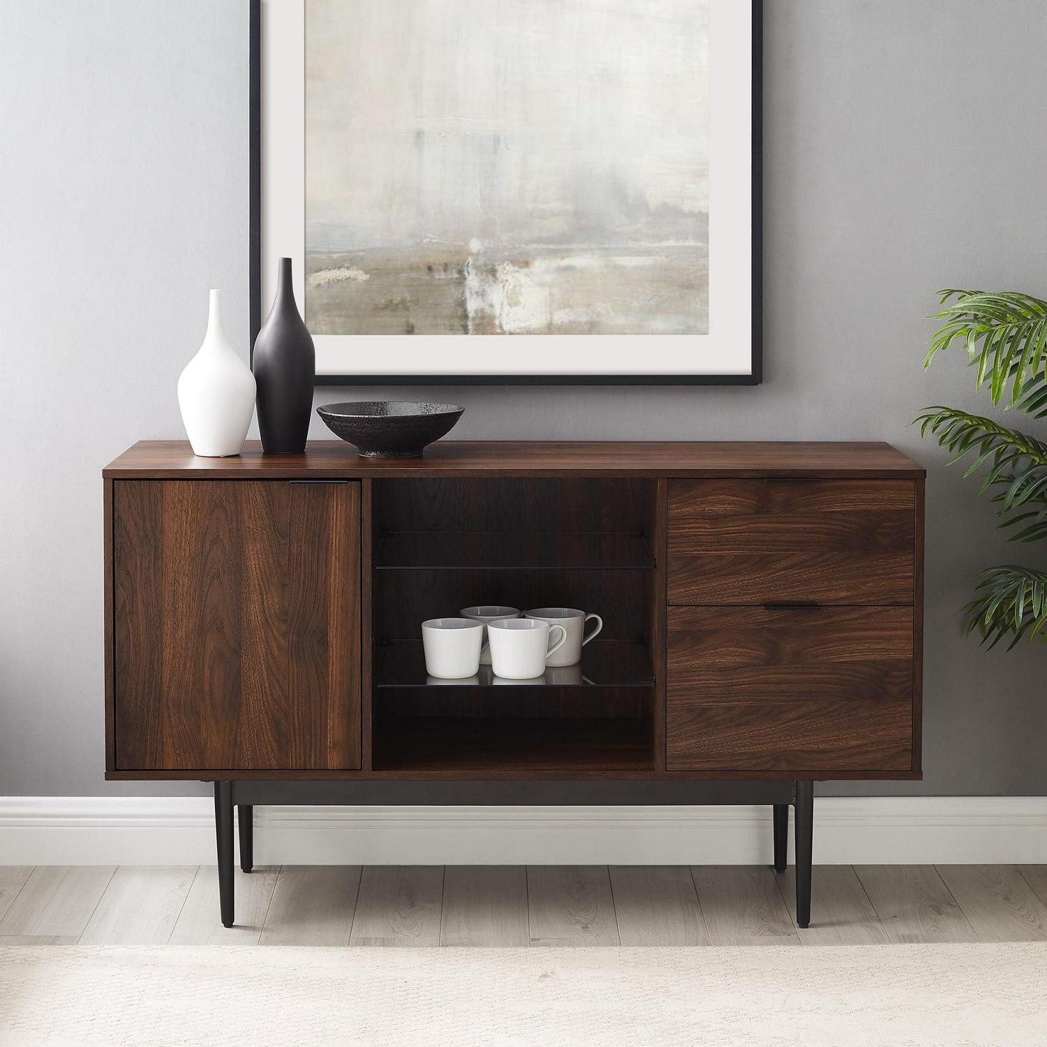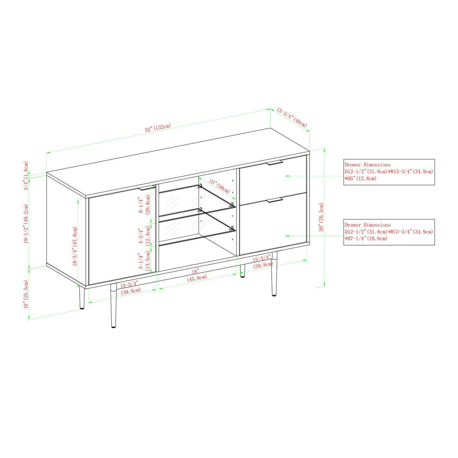Introduce modern aesthetic into your living room with the Desert Fields Blakely Mid Century 2-Drawer Sideboard. The metal tapered legs provide retro flair while the boxy, two-tone design and metal handles offer a trendy look that elevates any home decor. With a combination of closed and open storage solutions, you can take advantage of all the options included in this media stand. One adjustable shelf behind a door and two drawers on telescoping metal glides create space for items you want to keep hidden from view and two open-storage, adjustable glass shelves in the center of the piece offer a place to set gaming consoles or other media accessories for the perfect watch party or gaming tournament. Plus, with 52 inches of space on top, this stand can safely accommodate TVs up to 58 inches. Bring home the beauty of Desert Fields Blakely Mid Century 2-Drawer Sideboard today.