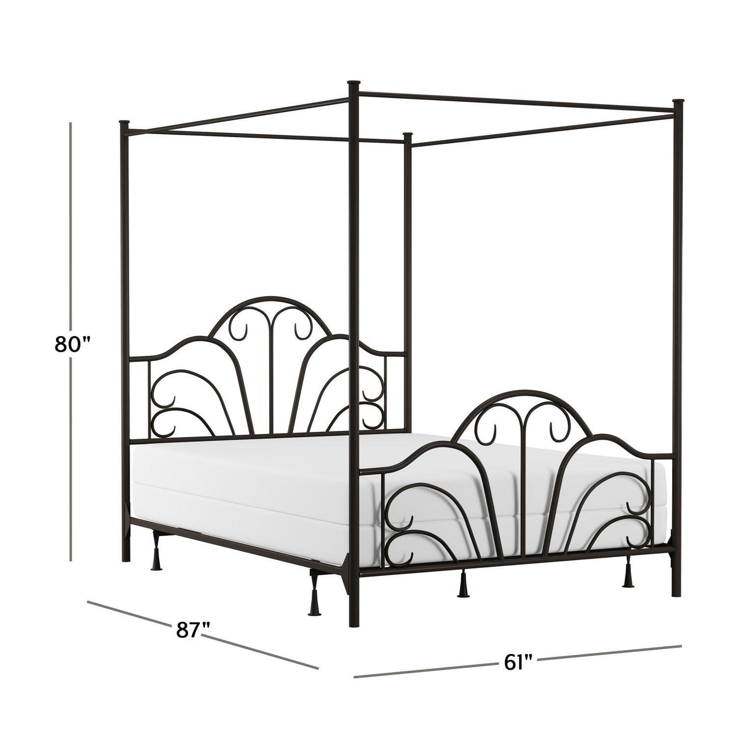 - Elegant and whimsical queen metal canopy bed with scroll details offset by a simple canopy frame