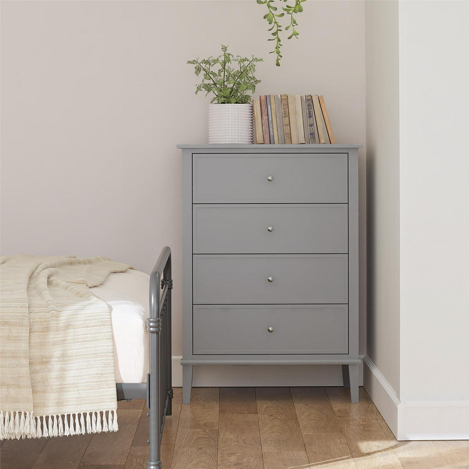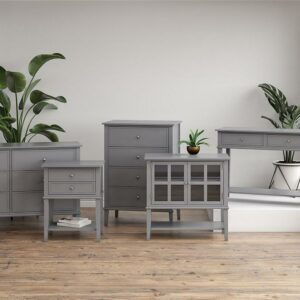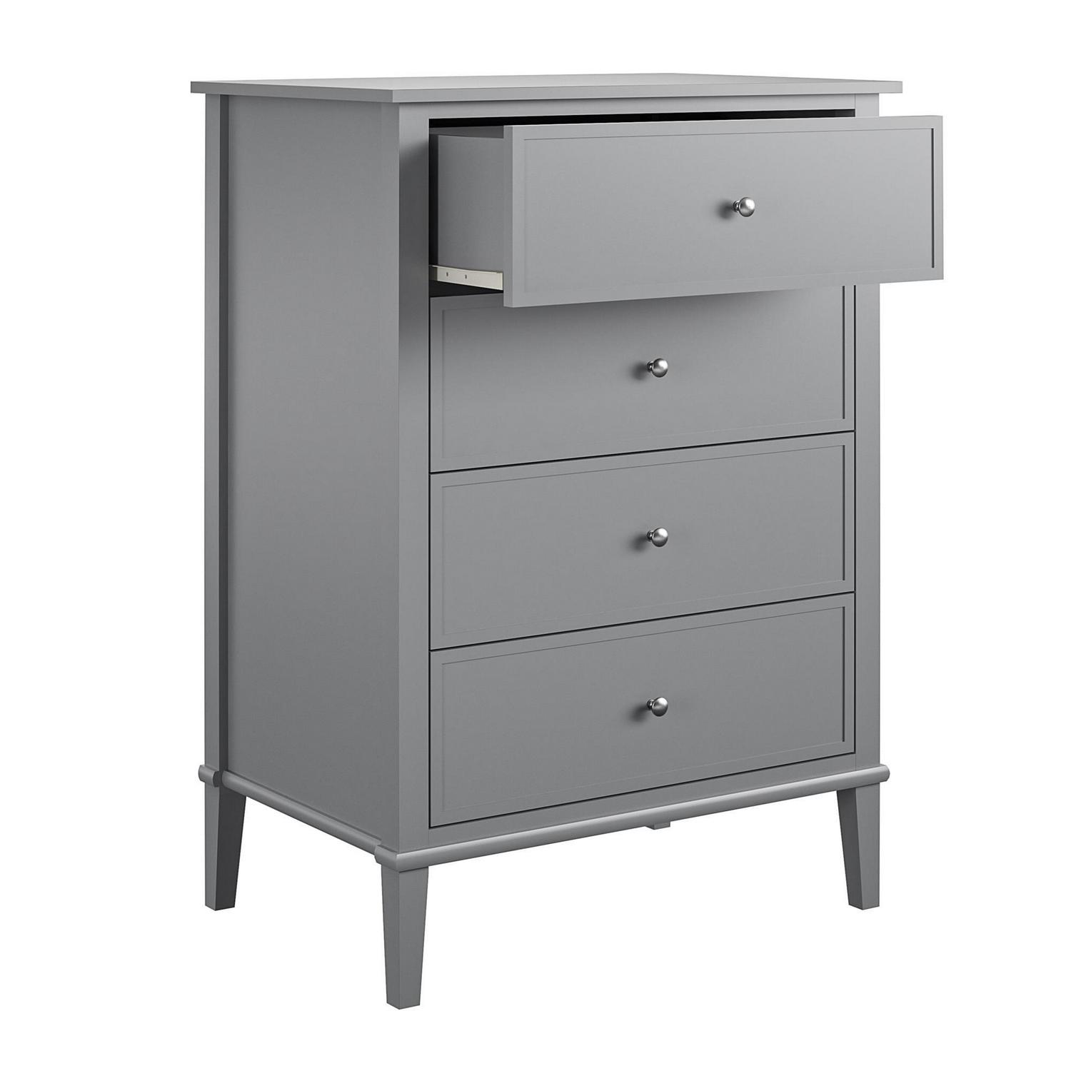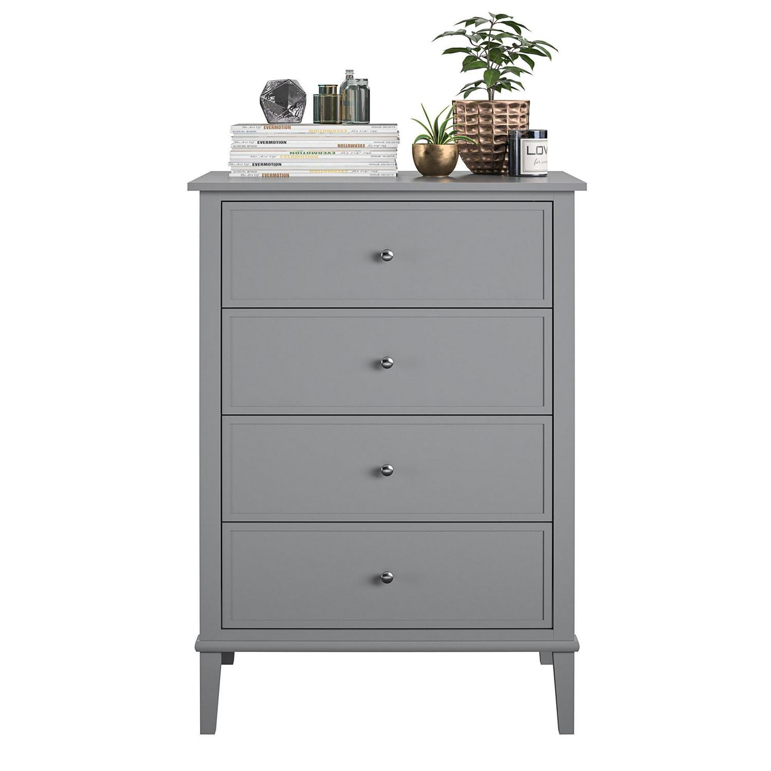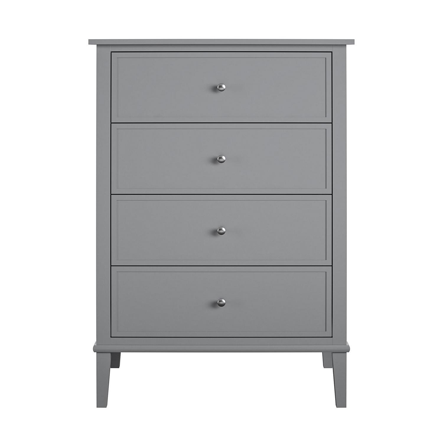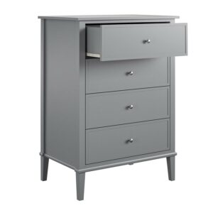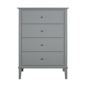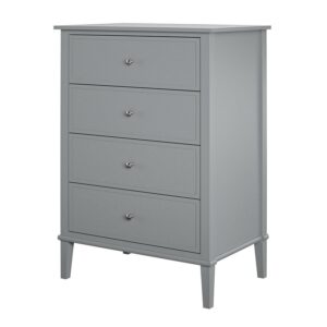 Upgrade your bedroom with the Ameriwood Home Franklin 4 Drawer Dresser. The beautiful gray finish on the painted MDF will look great with any style and décor and will last for years to come. The 4 drawers can organize all of your folded clothing and extra linens to keep your bedroom and closet clutter free. Each drawer features durable metal slides and are finished in a linen look paper to prevent clothes from snagging on raw edges. A wall anchor kit is included to secure the Dresser to the wall and prevent tipping injuries. The Dresser ships flat to your door and requires assembly upon opening. Two adults are recommended to assemble. Once assembled, the Dresser measures to be 41.3″H x 29.7″W x 19.7″D.