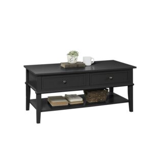 Keep your entertainment essentials nearby on the Desert Fields Eclectic Boho Coffee Table. Made of painted MDF and solid wood legs, the black finish can easily be added into your existing décor. The decorative molding and tapered legs give this Table an elegant look for an instant upgrade for your living space. The spacious table top offers plenty of room for your remotes, decorations, and tablets. The open lower shelf is perfect for books and magazines or extra blankets. The Table features 2 drawers to store away small items and electronics to keep your table top clutter free. Finish your living room with the entire Eclectic Boho collection and make your house a home (each sold separately). The Table ships flat to your door and requires assembly upon opening. Two adults are recommended to assemble. Once assembled, the Table measures to be 18.5 H x 41.14 W x 20.6 D.