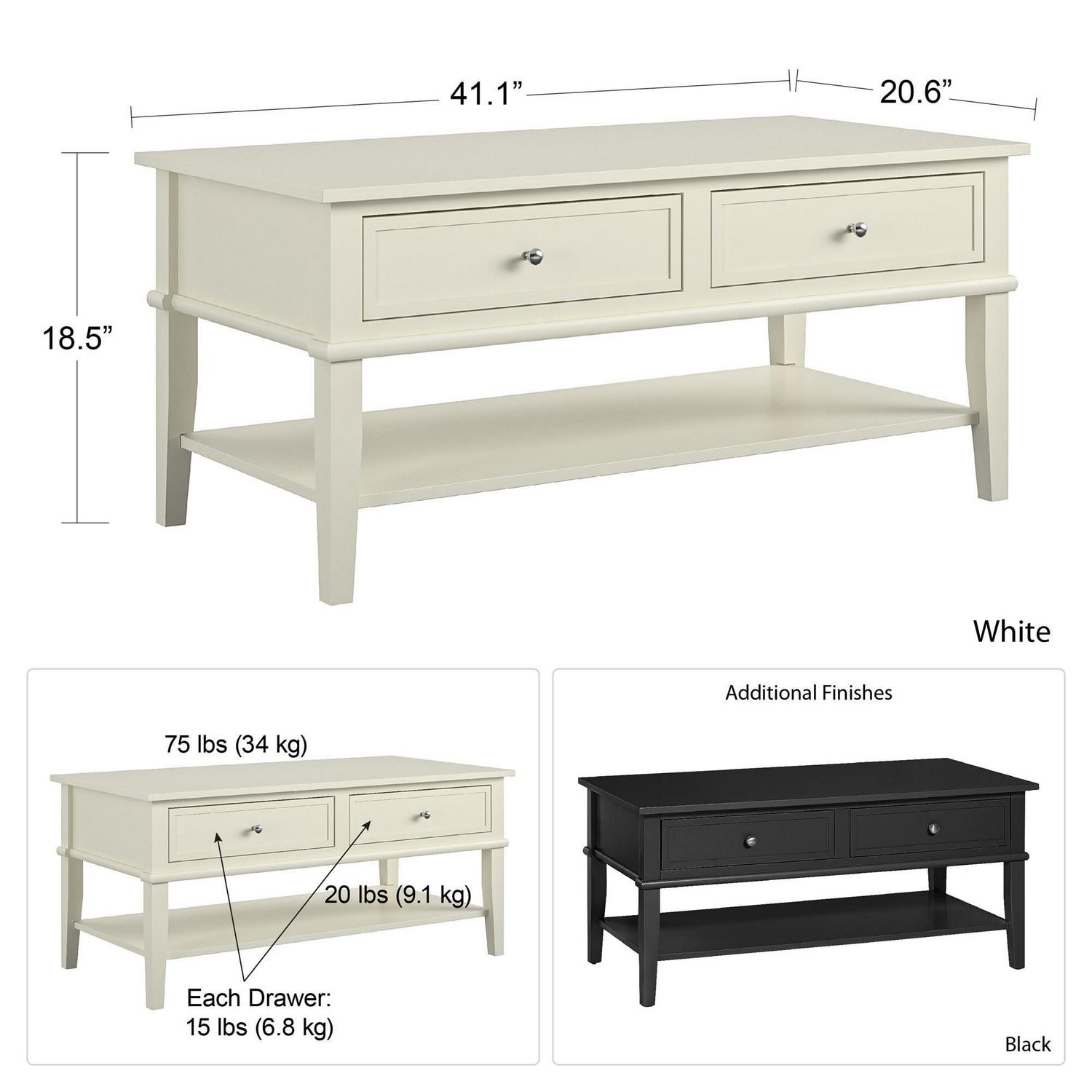 – The Table ships flat to your door and 2 adults are recommended to assemble. The table top can hold 75 lbs. and the lower shelf will hold 20 lbs. The drawers can hold up to 15 lbs. each. Assembled dimensions: 18.5 H x 41.14 W x 20.6 D