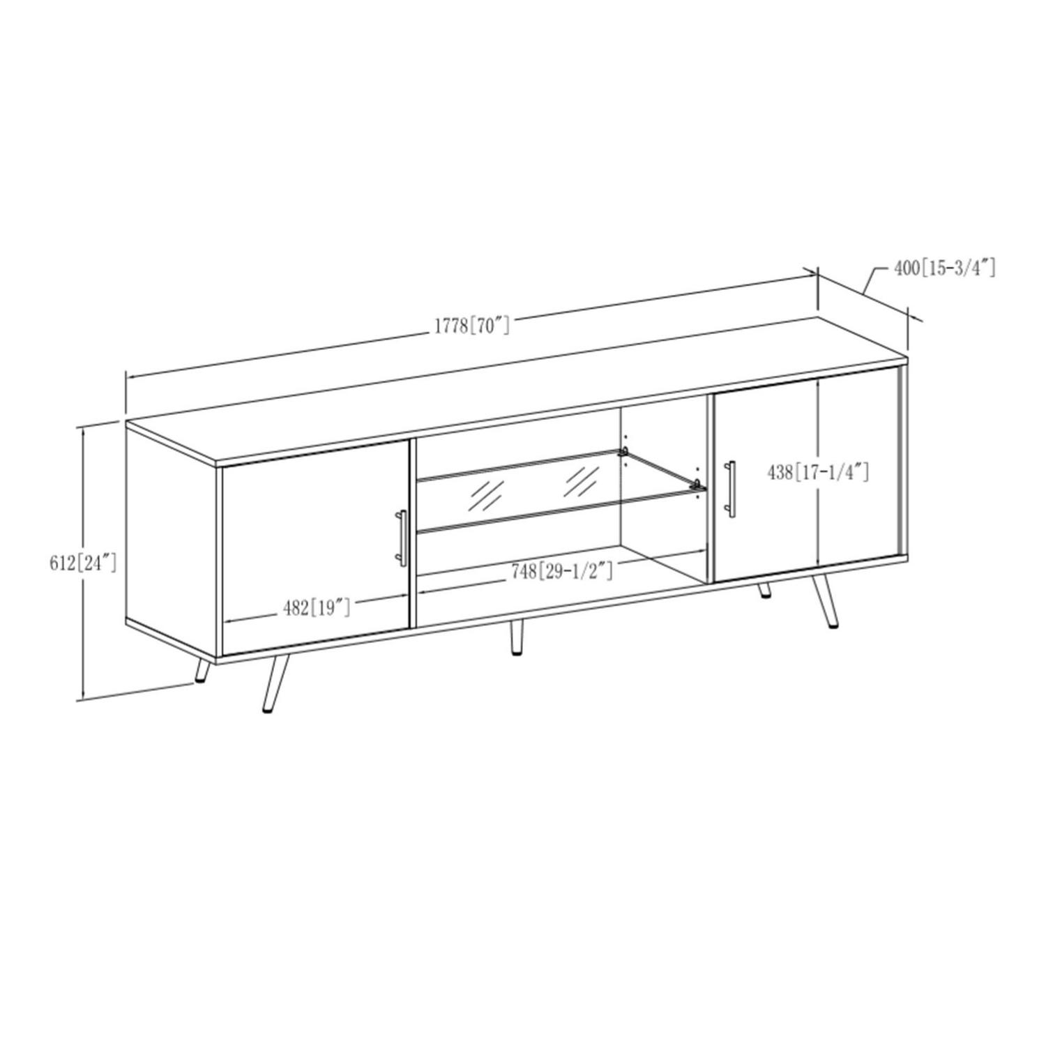 Display your great taste with the Desert Fields Thea Mid-Century Two-Door TV Stand. The angled legs and modern silhouette show guests a mature, retro aesthetic that complements any home decor. The center’s open storage provides a place to display family photos or place gaming consoles and the top will accommodate TV’s up to 80″. The two side doors with metal hinges each hide an adjustable shelf for speakers and movies. Made from warp-resistant MDF, durable laminate, tempered glass, and powder-coated steel, this entertainment stand will be a long-lasting addition to your home. Complete the look of your room with the Desert Fields Thea Mid-Century Two-Door TV Stand.