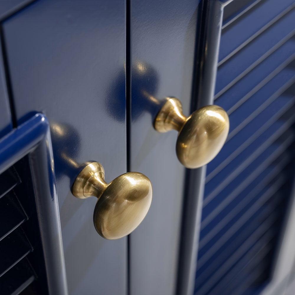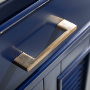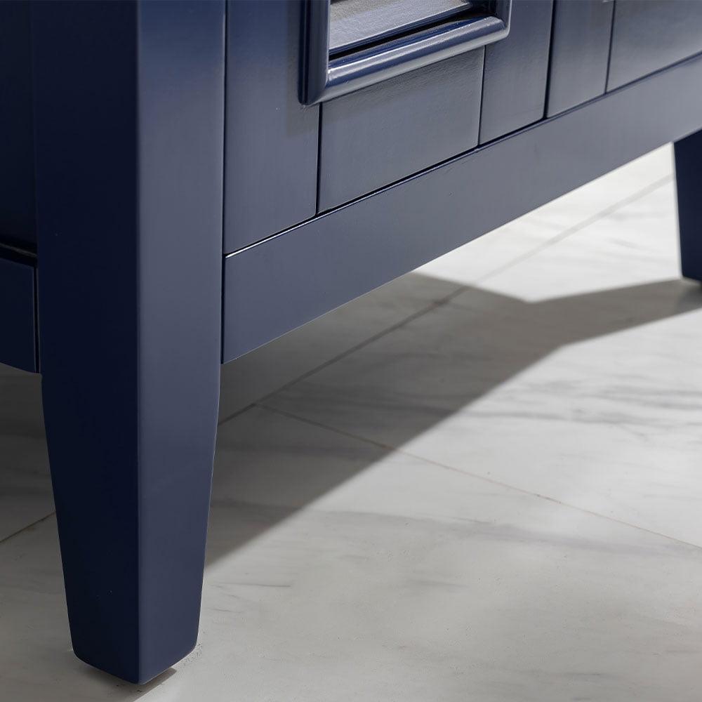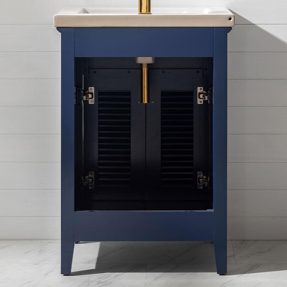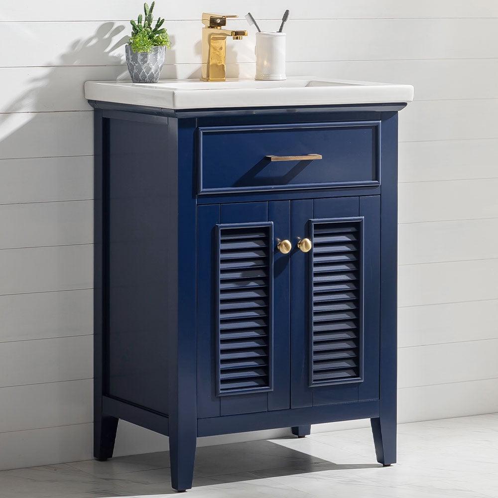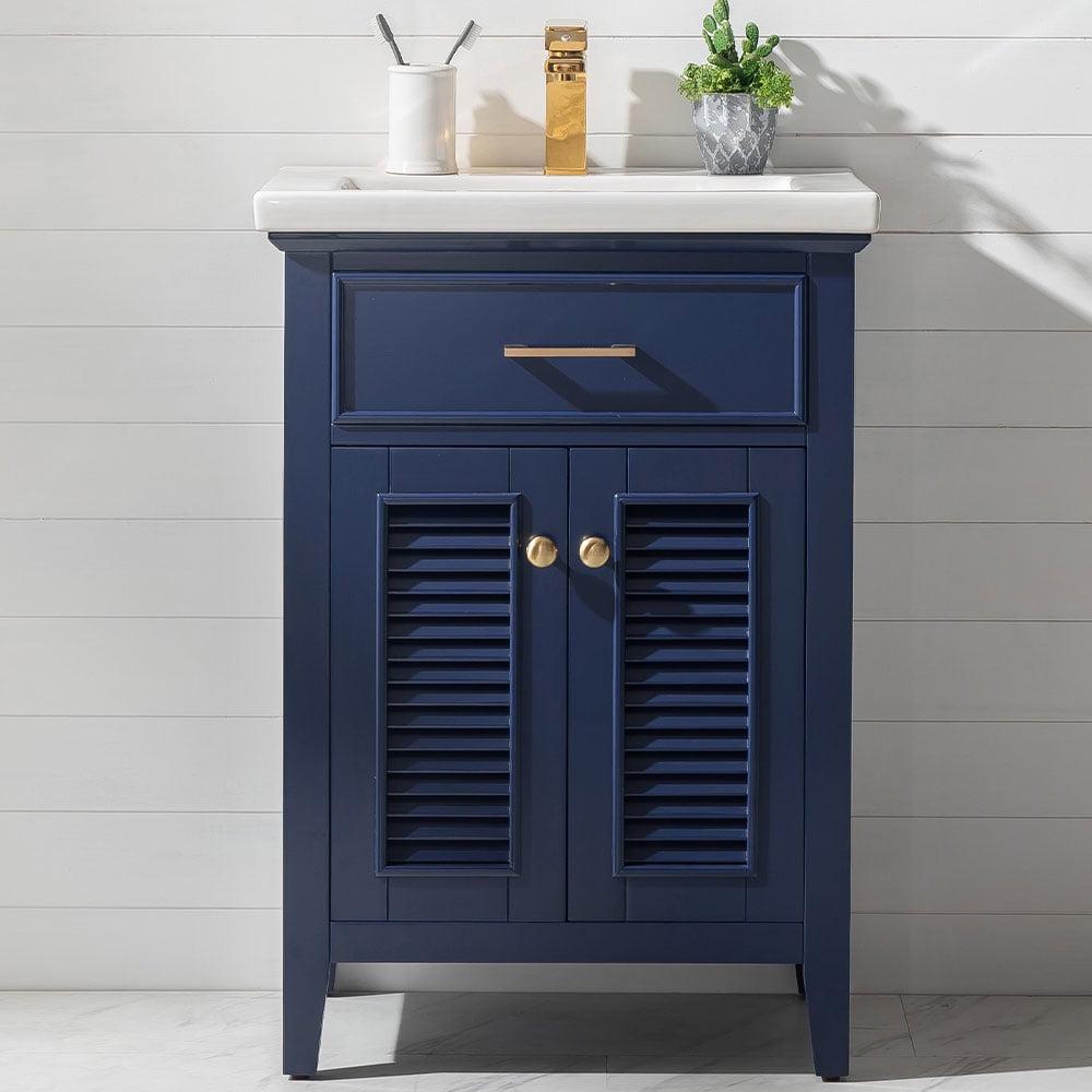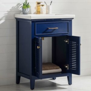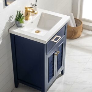 The Cameron 24 Single Sink Vanity by Design Element provides the perfect finishing touch to your bathroom remodel project. Constructed of solid hardwood, this vanity will maintain its beauty and functionality year after year. The porcelain countertop and integrated sink with overflow perfectly matches the styling of the cabinet, and is extremely simple to maintain. Opening the 2 soft closed doors reveals an ample storage space. The included satin brass hardware provides the perfect finishing touch to the blue cabinet. Faucet and drain are not included.