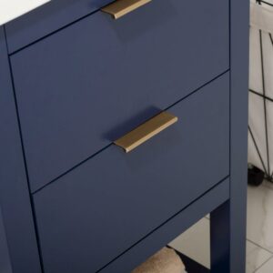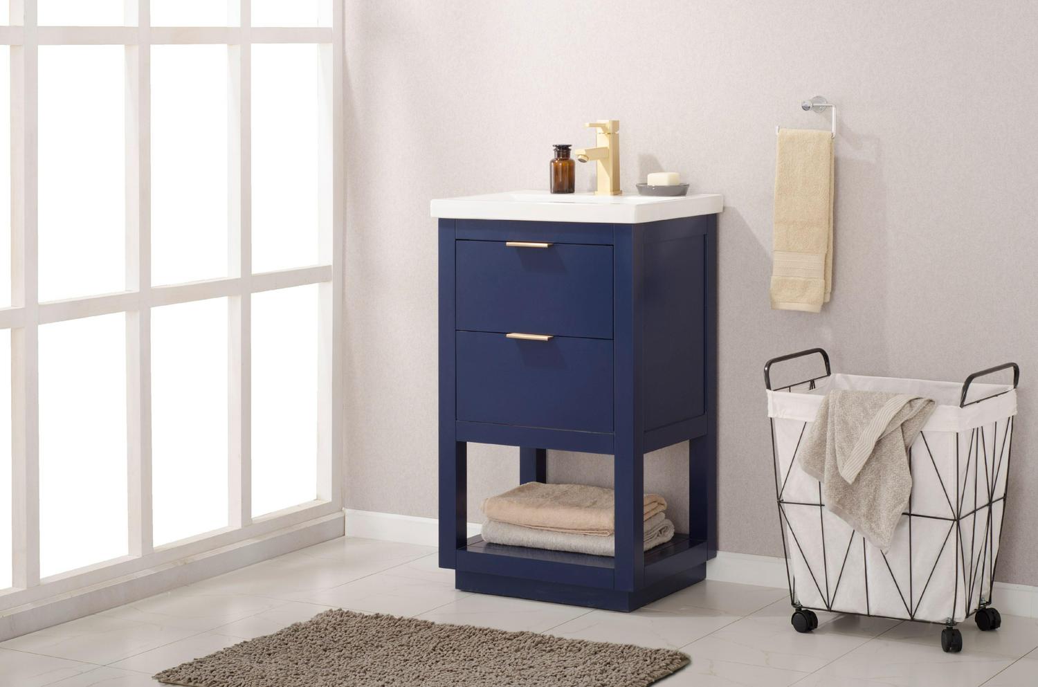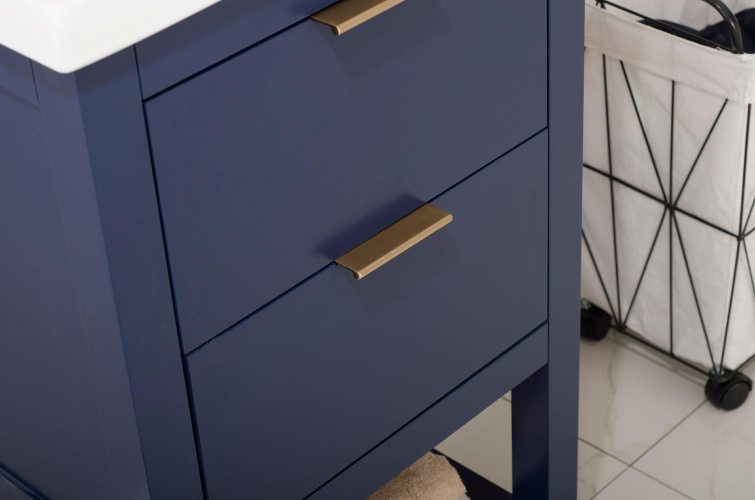 The Klein 24 Single Sink Vanity by Design Element provides the perfect finishing touch to your bathroom remodel project. Constructed of solid hardwood, this vanity will maintain its beauty and functionality year after year. The porcelain countertop and integrated sink with overflow perfectly matches the styling of the cabinet, and is extremely simple to maintain. There is ample storage space for this vanity despite its small size. Hidden in the flip down drawer is a unique and useful storage box, and a second fully functional drawer constructed with dovetail joinery sits on soft close glides. There is also an open shelf at the base of the cabinet. The included satin gold hardware provides the perfect finishing touch to the blue cabinet. Faucet and drain are not included.