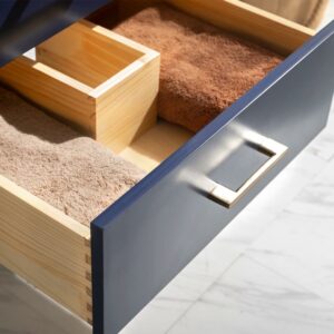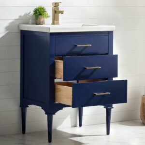 The Mason 24 Single Sink Vanity by Design Element provides the perfect finishing touch to your bathroom remodel project. Constructed of solid hardwood structure with manufactured wood panels, this vanity will maintain its beauty and functionality year after year. The porcelain countertop and integrated sink with overflow perfectly matches the styling of the cabinet, and is extremely simple to maintain. Each of the 2 fully functional drawers are constructed with dovetail joints and soft close glides. This vanity set include brushed brass hardware perfectly complements the blue cabinet. Faucet and drain are not included.
