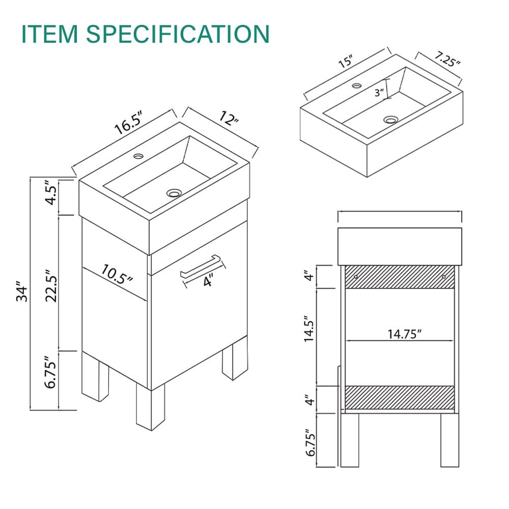 The stylish Stella vanity collection by Design Element is the perfect solution for your small powder room renovation project. The Stella vanity is compact in size, yet it features a generously sized basin and wood cabinet with plenty of storage place. Whether you choose to wall-mount the cabinet as a floating vanity or use the included aluminum finished wood legs as a free-standing vanity, the results will be equally pleasing. The porcelain integrated sink is both beautiful and low maintenance, and the concealed adjustable hinges will insure a soft and quiet closing of the cabinet door every single time. Mirror, faucet, and drain are not included.