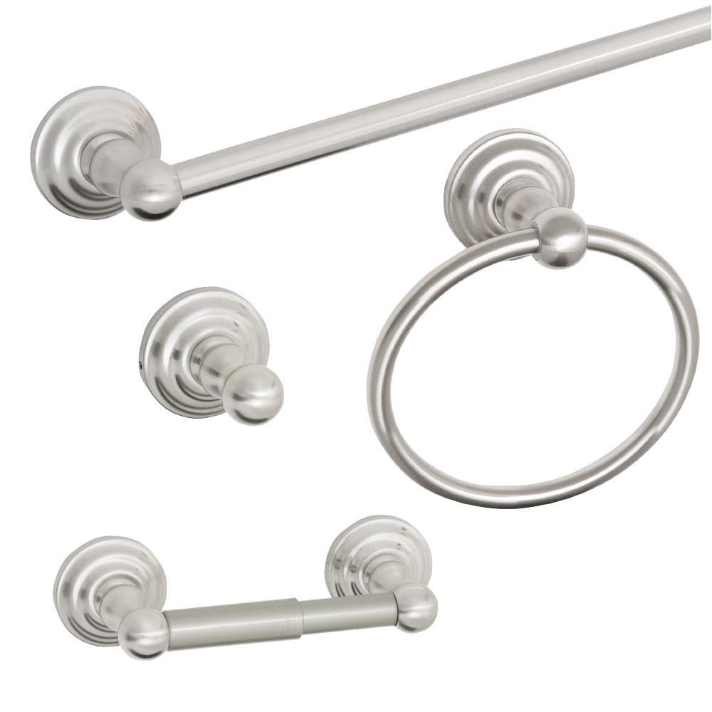 The Design House Calisto 4-Piece Bathroom Accessory Kit completes the look of your bathroom with a towel ring, robe hook, towel bar and toilet paper holder. Use all four pieces for a cohesive look throughout the bathroom. Made of zinc and aluminum with a satin nickel finish, the concealed screws add a casual elegance to your bathroom. Ez Anchor mounts are included in this kit for installation on drywall and a mounting template is printed on the back of the package. Anchors are a cleaner alternative to plugs. Save time and create a sturdy mount. Complete the look of your home with the rest of the Calisto collection, which features other bathroom accessories. Designed and manufactured by Design House, the trusted source for quality lighting, hardware, plumbing, kitchen, and bath products for every taste and budget.This product comes with a 1-year limited warranty