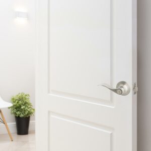 The Design House 190876 Springdale Privacy Door Handle in Satin Nickel and ergonomic shape, this door handle features versatility in style and design that coordinates well with traditional, rustic, and industrial farmhouse styles alike. This lever is operated by a turn-button knob on one side, perfect for bathroom and bedroom doors or wherever privacy is needed. Designed for left or right-hand doors, this door lever fits the two most common backsets in the U.S. (2-3/4 inches and 2-3/8 inches). The durable 2-way latch has a 1/2 inch latch bolt plated in nickel and does not budge once in place. Use this locking lever on standard 1-3/8 inches and 1-3/4 inches thick doors. This lock has a 1-inch by 2-1/4 inches radius corner faceplate and features a 5-pin cylinder for your security. If you are preparing your door for installation, the cross bore should be 2-1/8 inches in diameter and the edge bore should be 1 inch in diameter. This latching door handle is ANSI Grade-3 certified and rated for residential security. By installing the Design House Springdale Privacy Lockset in your home, you gain a sense of security and comfort. Designed and manufactured by Design House, the trusted source for quality lighting, hardware, plumbing, kitchen, and bath products for every taste and budget.This product comes with a 5-year mechanical and 5-year limited finish warranty