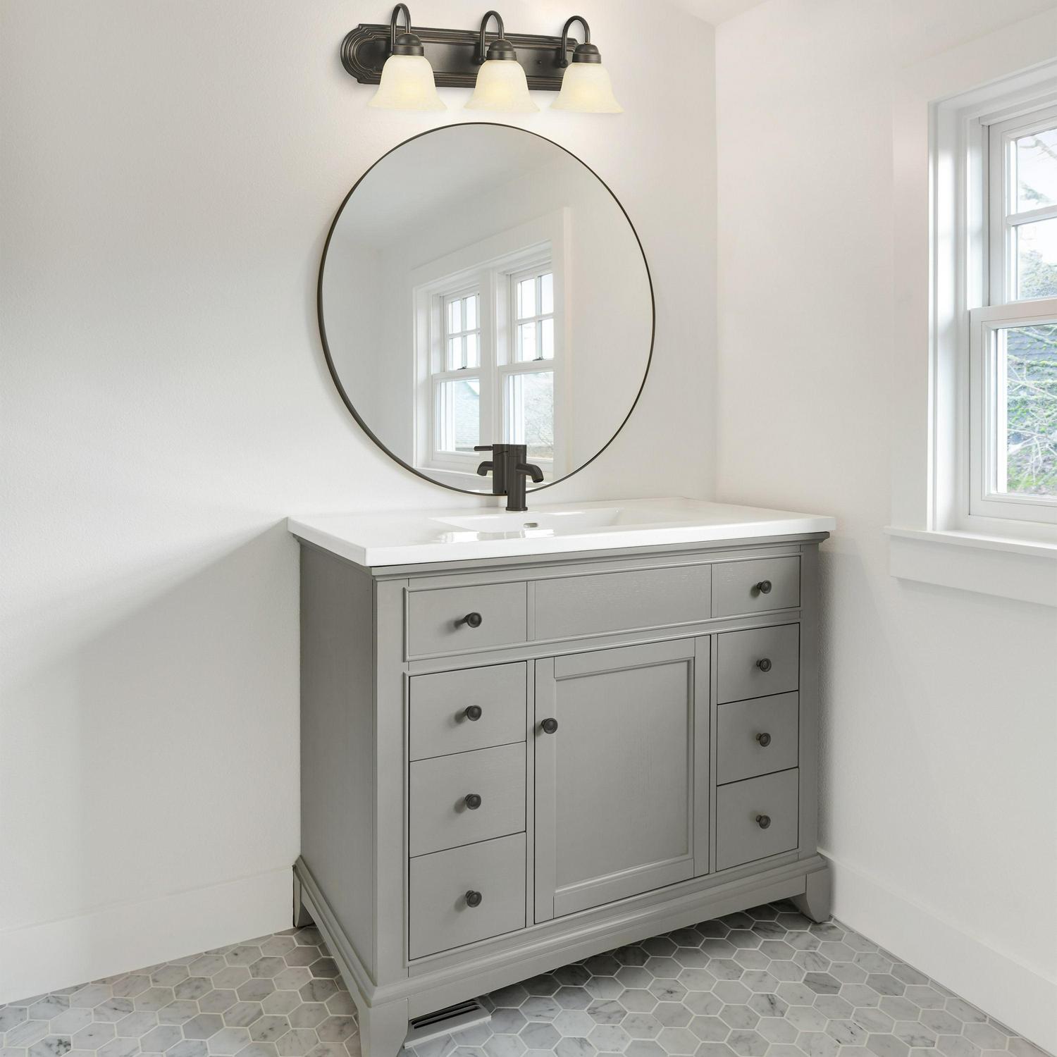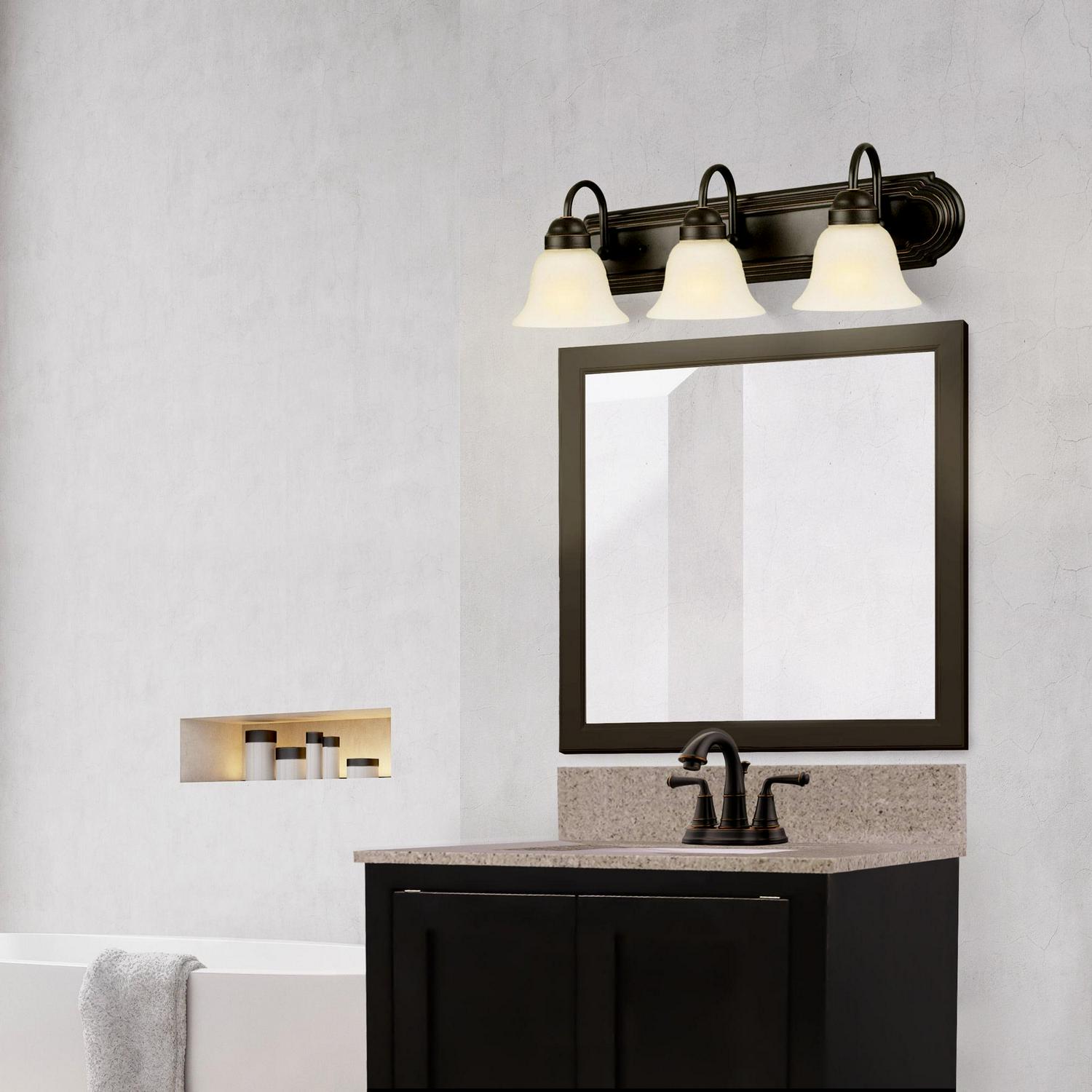 The Design House Allante 3-Light Vanity Light has frosted glass and curved arms that will add elegance to any room. This renovation-friendly vanity light features a large backplate to minimize paint touchups and drywall repair when replacing an existing vanity light. Constructed of formed steel with an oil rubbed bronze finish, this 3-light wall light adds style to your home. Measuring 8-inches (H) by 24-inches (W), the vanity light works great above a bathroom mirror or vanity. This fixture uses three 60-watt medium base bulbs or LED equivalent. Designed and manufactured by Design House, the trusted source for quality lighting, hardware, plumbing, kitchen, and bath products for every taste and budget.Comes with a 10-Year limited warranty that protects against defects in materials and workmanship. This wall mount is UL listed, UL approved for damp areas and is rated for 120-volts.