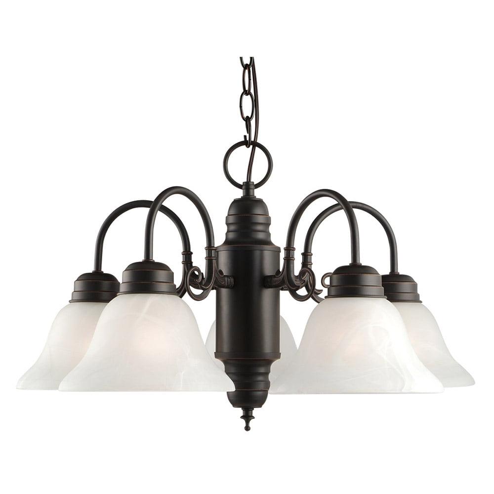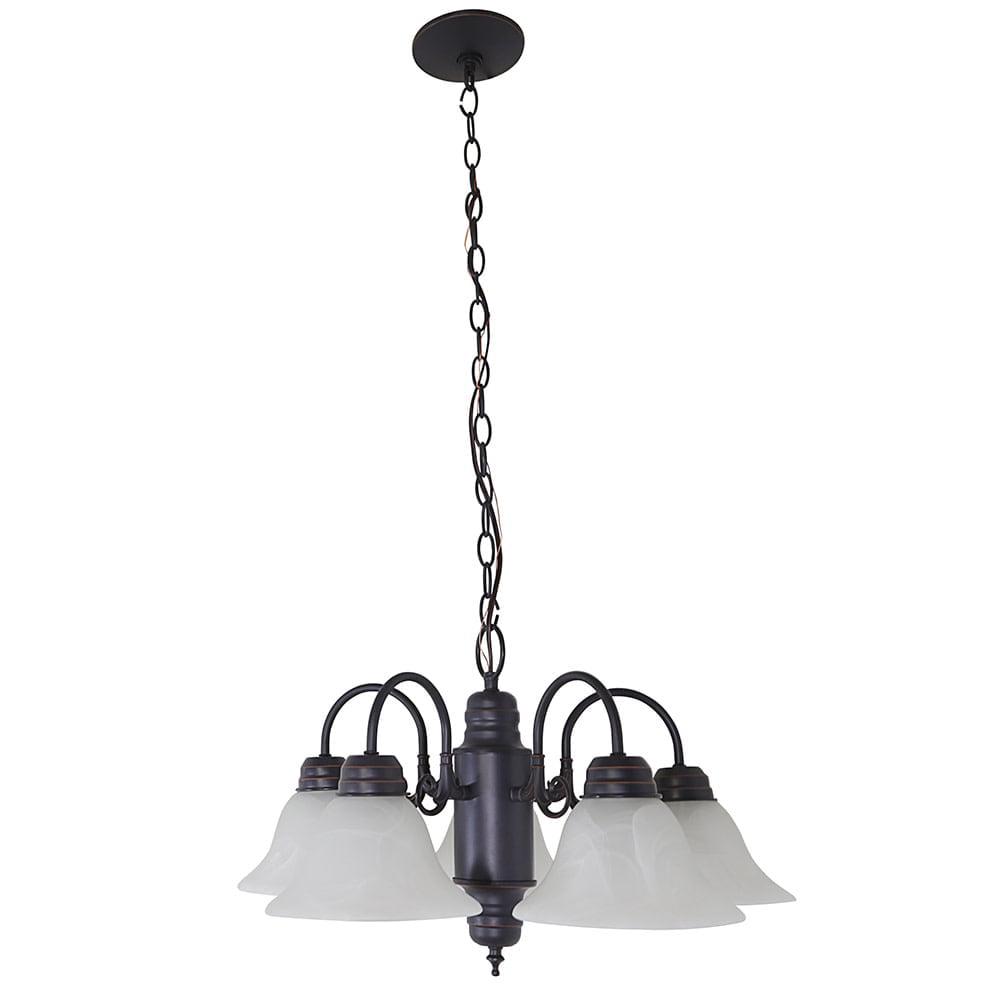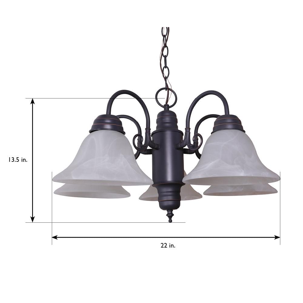 The Design House 514455 Millbridge 5-Light Chandelier is made of formed steel, alabaster glass, and finished in oil-rubbed bronze. This five-light chandelier is made for 120-volts and uses (5) 60-watt medium-base bulbs. This chandelierfoots sprawling arms meet five downward facing lamps gently diffusing light from above. Measuring 13-1/2inch by 22inch, this 9.3-pound fixture has a 48inch chain to extend from high ceilings. Curved lines and soft details add a modern accent in a kitchen, dining room, or entryway. The Millbridge collection features a beautiful matching pendant, wall sconce, ceiling mount, and vanity light.This Product is ETL and cETL listed. The Design House 514455 Millbridge 5-Light Chandelier comes with a 10-Year limited warranty that protects against defects in materials and workmanship.