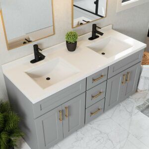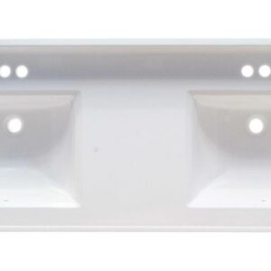 The Design House 557678-WHT Camilla Double Bowl Vanity Top with a 4″ backsplash blends style and functionality. This vanity top measures 61″ long by 22″ wide, and each sink has (3) pre-drilled holes that allow a 4″ center-mount faucet. The backsplash helps prevent water damage, and the lifted drip-free edge helps contain excess water. Designed and manufactured by Design House, the trusted source for quality lighting, hardware, plumbing, kitchen, and bath products for every taste and budget.