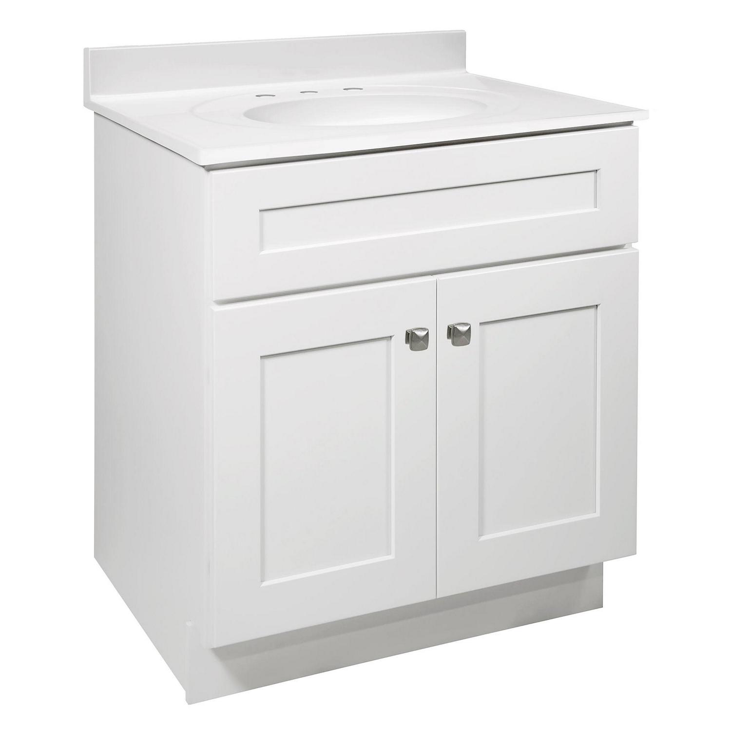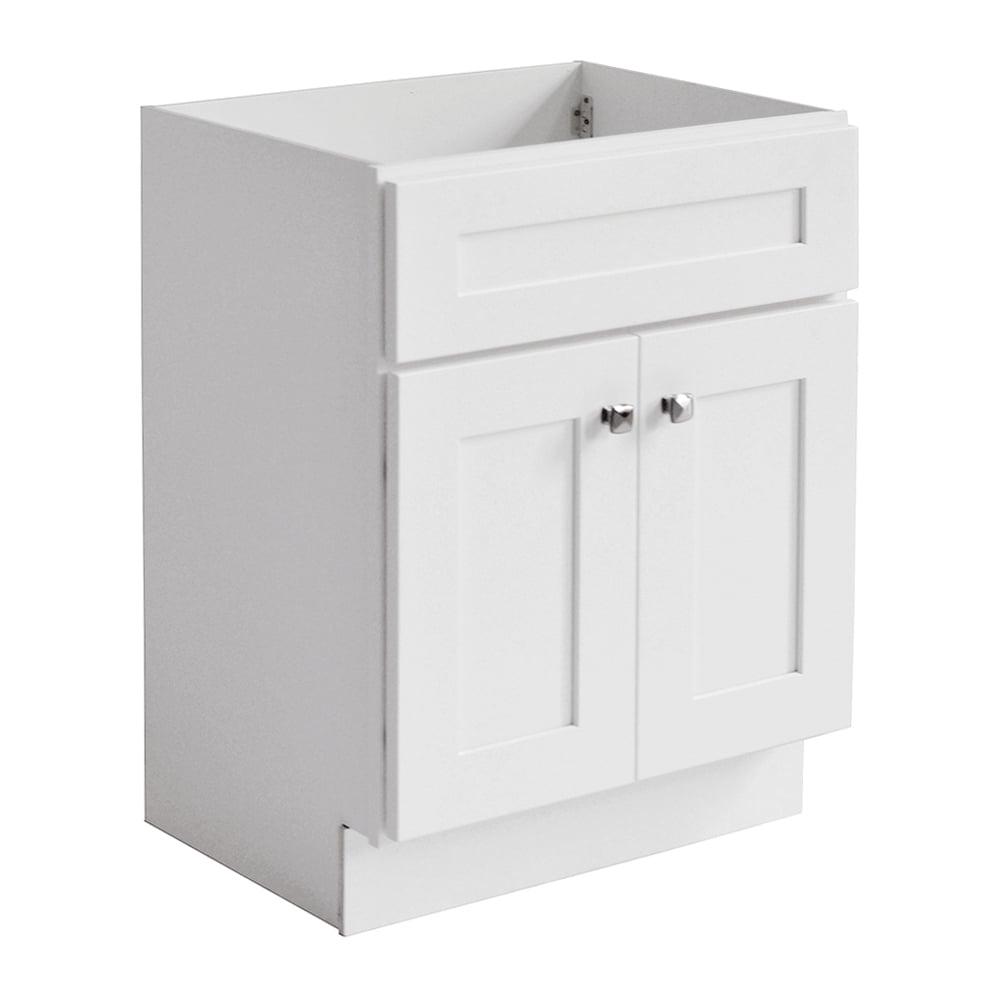 This Design House 30inch Brookings Bathroom Vanity Cabinet offers a look that will match any style, from rustic to modern. All vanities come equipped with 6-way adjustable soft-close hinges so your doors can remain as quiet as possible. Features include a 3inch wide shaker door trim, 1/2inch plywood with poplar veneer for side and bottom panels, and a 3/4inch solid maple face frame. Our RTA (ready to assemble) cabinets use a metal clip connector system, making the assembly process fast and easy. Style of drawers/doors: Shaker, Number of drawers: 0, Number of doors: 2, Number of shelves: 0.This product is TSCA Title VI compliant and comes with a 1-year limited warranty