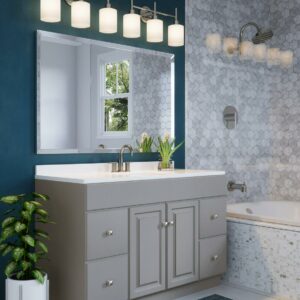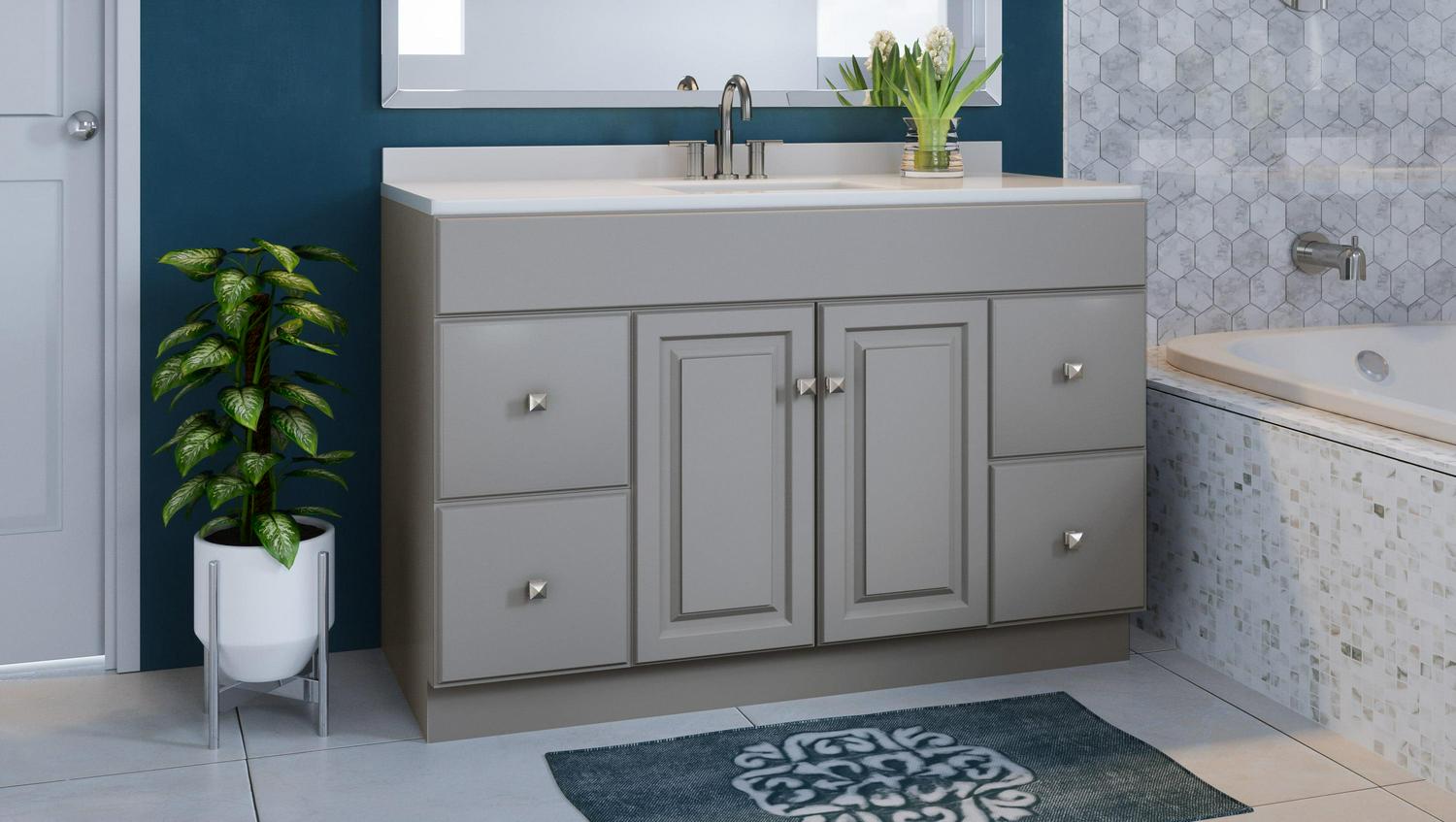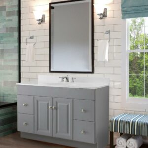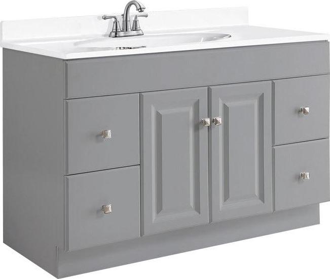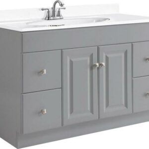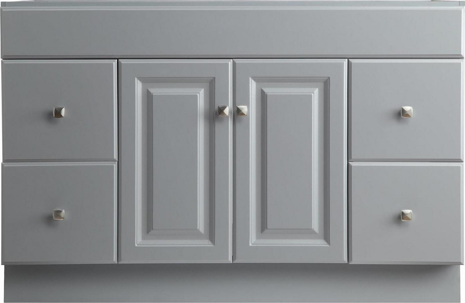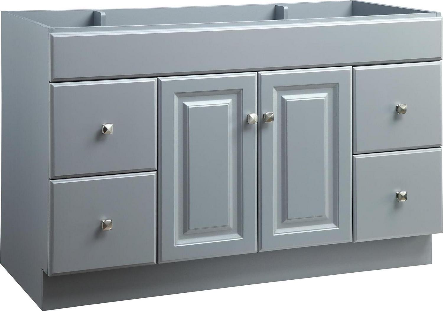 The Design House Wyndham Unassembled Vanity Without Top features a durable gray finish and satin nickel hardware. Perfect for any style home, this vanity has clean lines and concealed hinges. The 2-door, 4-drawer construction gives you plenty of storage for toiletries to keep your countertop free of clutter. The doors open fluidly, so they do not whine or creak. Measuring 48inch by 21inch by 31.5inch, this vanity can fit into most medium and larger-sized bathrooms. The frameless design provides ample storage and accessibility to store toiletries for the entire family. Traditional construction meshes with subtle modern details to quickly brighten up your bathroom. This product is perfect for remodeling your bathroom or new construction and matches a variety of vanity tops and wall colors.The Wyndham Unassembled Vanity without Top has a 1-year limited warranty that protects against defects in materials and workmanship.