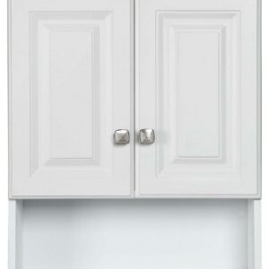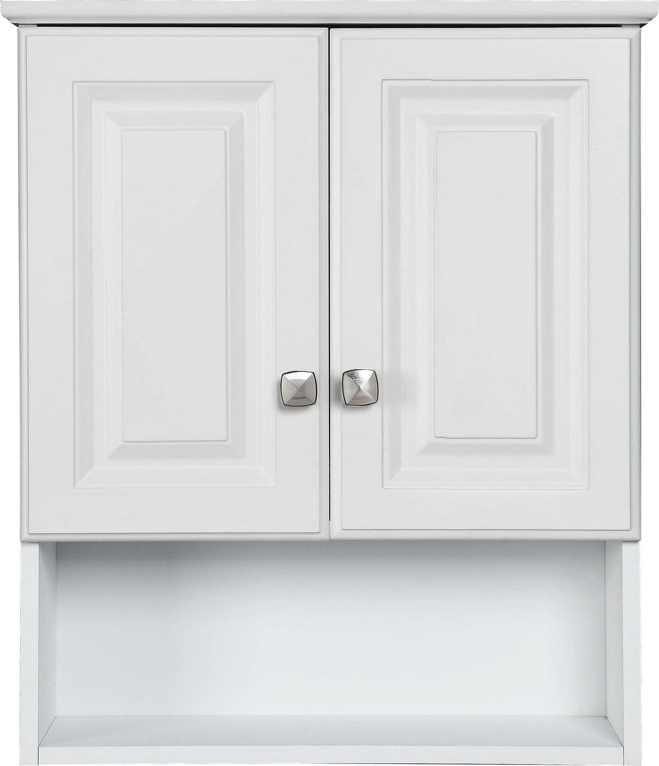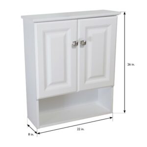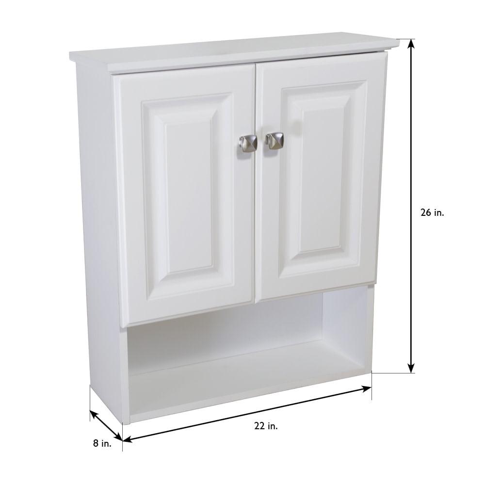 The Design House Wyndham White Bathroom Wall Cabinet features a white finish with satin nickel knob hardware. This product has a rustic shabby chic design, meshing modern construction with vintage aesthetics, and has a cam lock connector for fast and easy assembly. This item measures 22inch by 8inch by 26inch and adds a rustic charm to your home decor. This wall cabinet graces your home with its bright finish and clean lines with a country living design. This product is perfect for remodeling your bathroom and matches painted mirrors and granite countertops. This cabinet will not chip or stain in steamy bathrooms. The cabinet doors glide open, revealing a spacious compartment sturdy enough to hold shampoo, medicine, and makeup.The Wyndham 2-Door Wall Cabinet has a 1-year limited warranty that protects against defects in materials and workmanship.