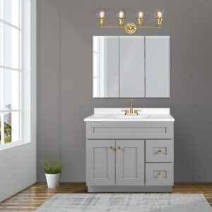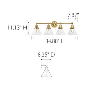 The Design House 589044-SG Augustin 4-light bathroom vanity light features a transitional design with its satin gold finish and cone-shaped seedy glass shades. The seedy glass conceals smudges, dirt, and fingerprints while capturing a brilliant glow of light. Pair this light with an Edison style light bulb to compliment the design aesthetic. This light is rated for 120-vlts and uses (4) 60 watt medium base bulb or LED equivalent (not included). Designed and manufactured by Design House, the trusted source for quality lighting, hardware, plumbing, kitchen, and bath products for every taste and budget.This product is UL listed for use in damp locations and comes with a 10-year limited warranty