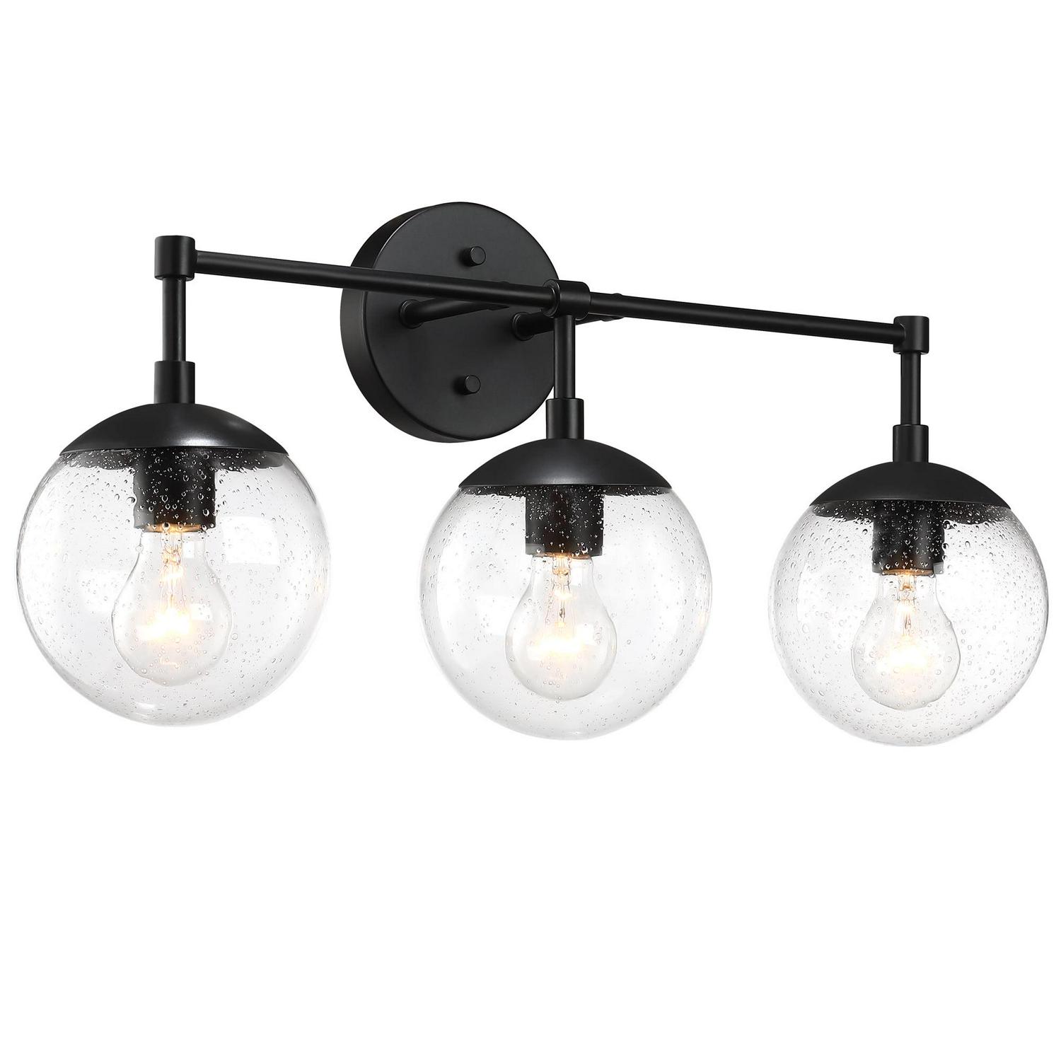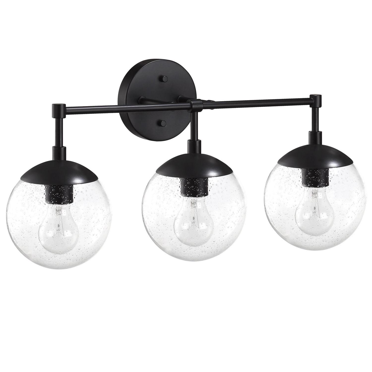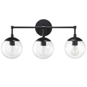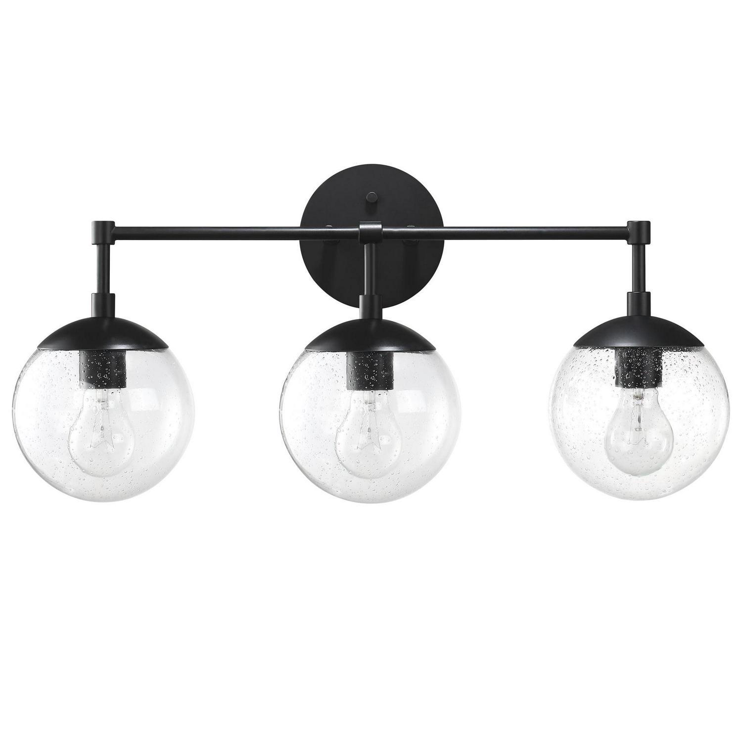 This Design House 588889-BLK Gracelyn 3-Light Vanity Light features a sleek matte black finish and clear, seedy glass globe shades. The seedy glass conceals smudges, dirt, and fingerprints while capturing light and adding a brilliant glow of light. This wall light is rated for 120-volts and uses (3) 60W standard medium base bulb or LED equivalent (not included). Designed and manufactured by Design House, the trusted source for quality lighting, hardware, plumbing, kitchen, and bath products for every taste and budget.This product is ETL listed for use in damp locations and comes with a 10-year limited warranty