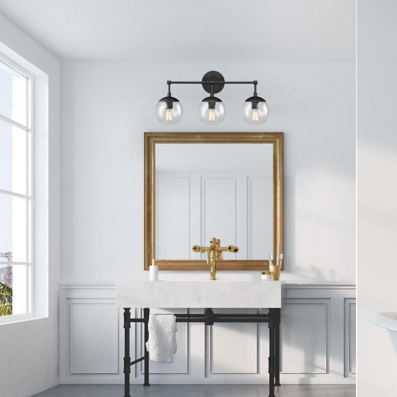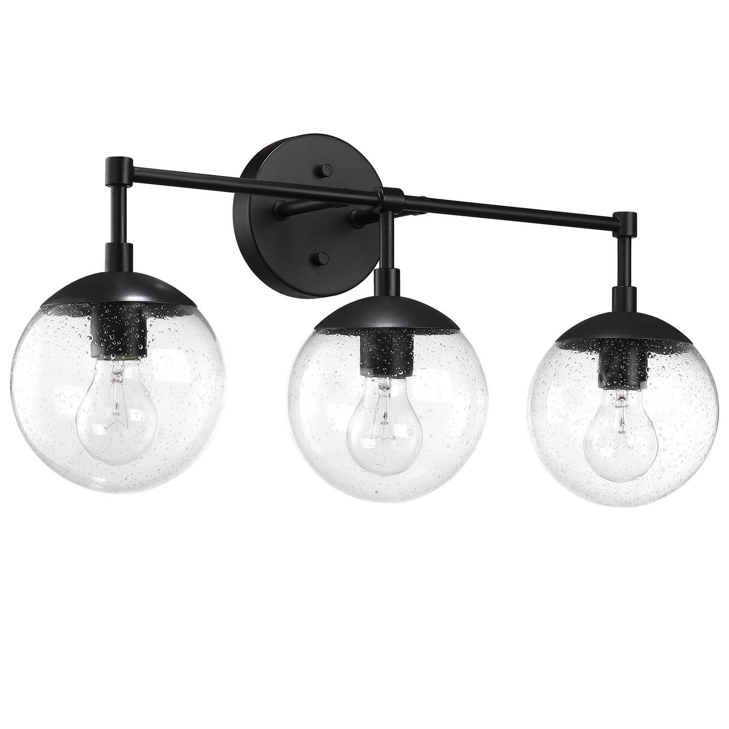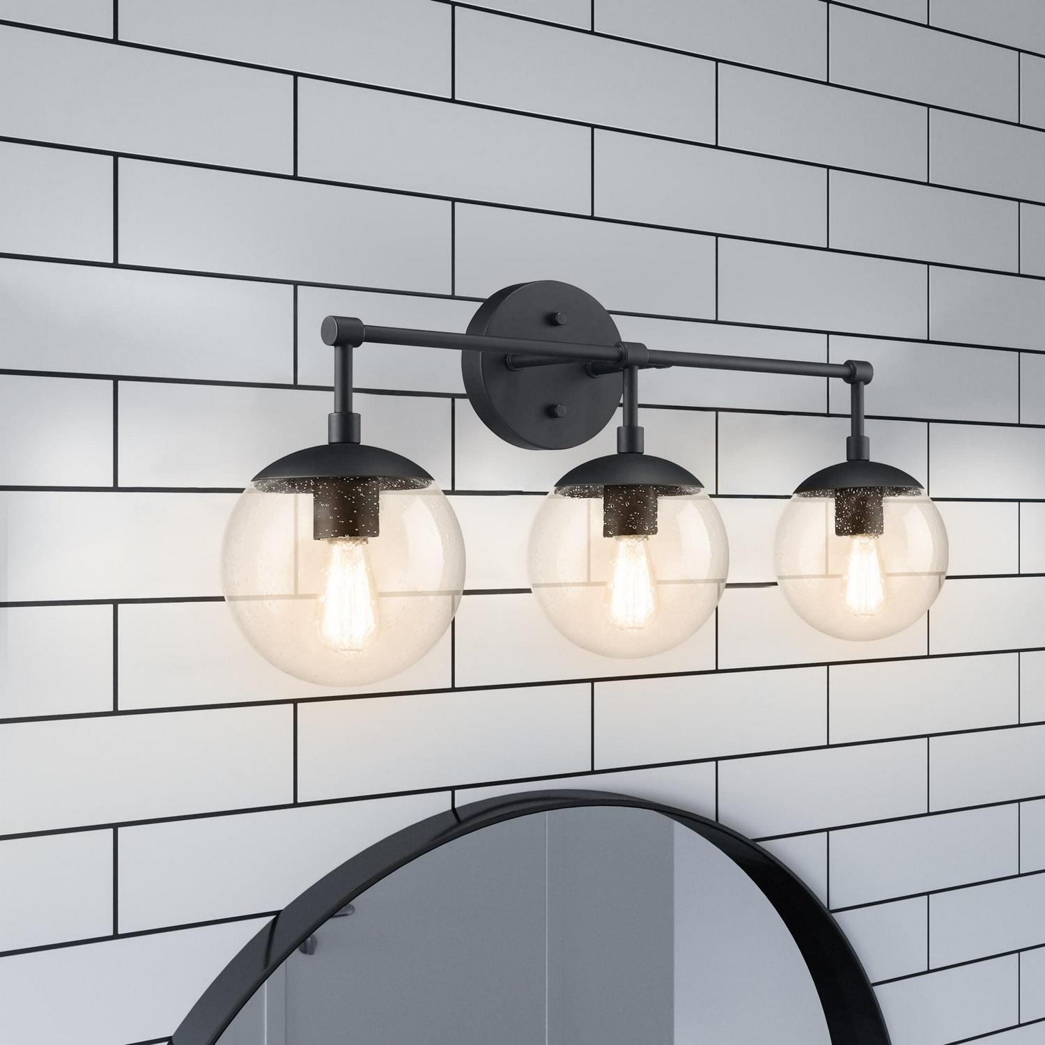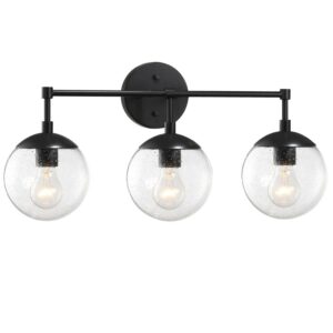 This Design House 588889-BLK Gracelyn 3-Light Vanity Light features a sleek matte black finish and clear, seedy glass globe shades. The seedy glass conceals smudges, dirt, and fingerprints while capturing light and adding a brilliant glow of light. This wall light is rated for 120-volts and uses (3) 60W standard medium base bulb or LED equivalent (not included). Designed and manufactured by Design House, the trusted source for quality lighting, hardware, plumbing, kitchen, and bath products for every taste and budget.This product is ETL listed for use in damp locations and comes with a 10-year limited warranty