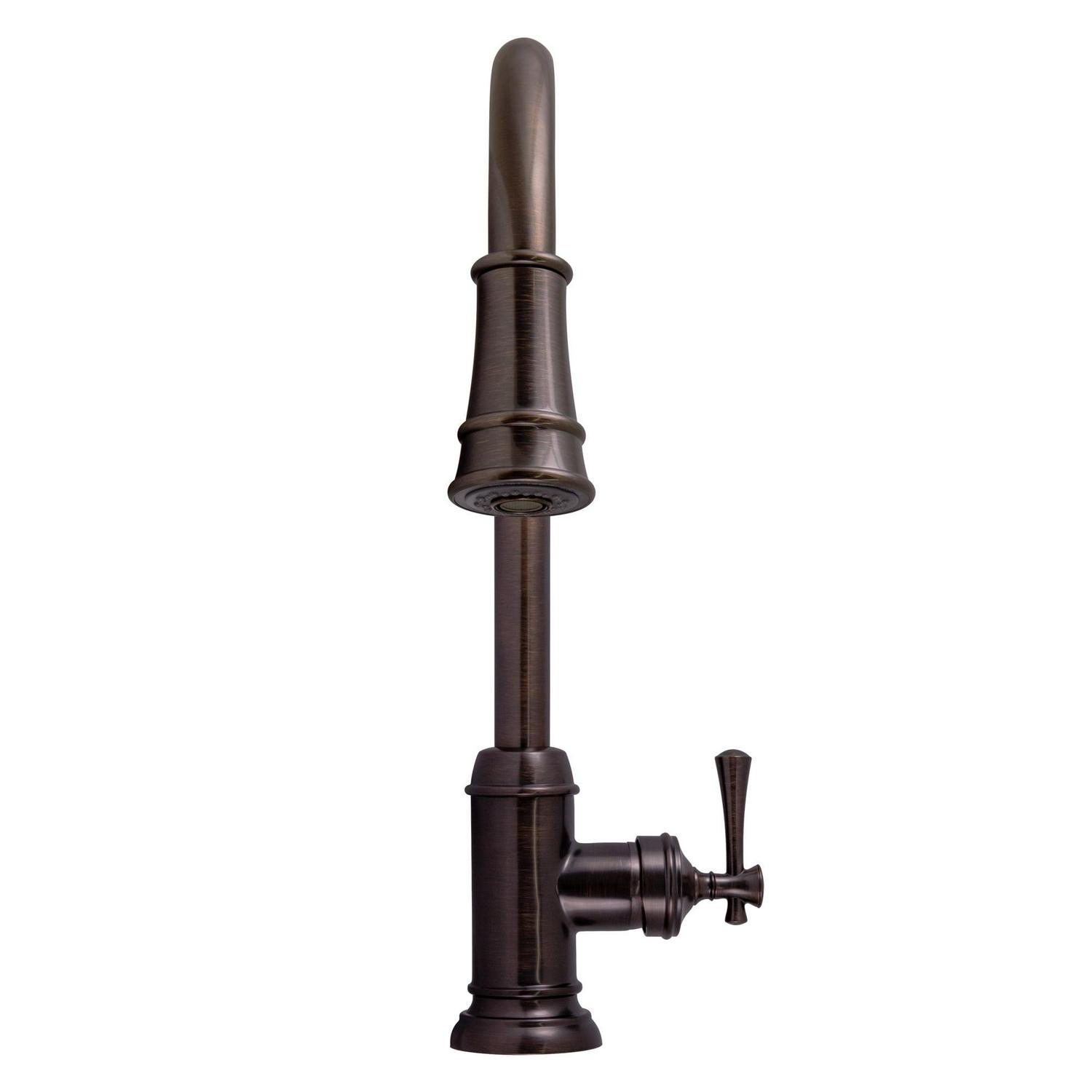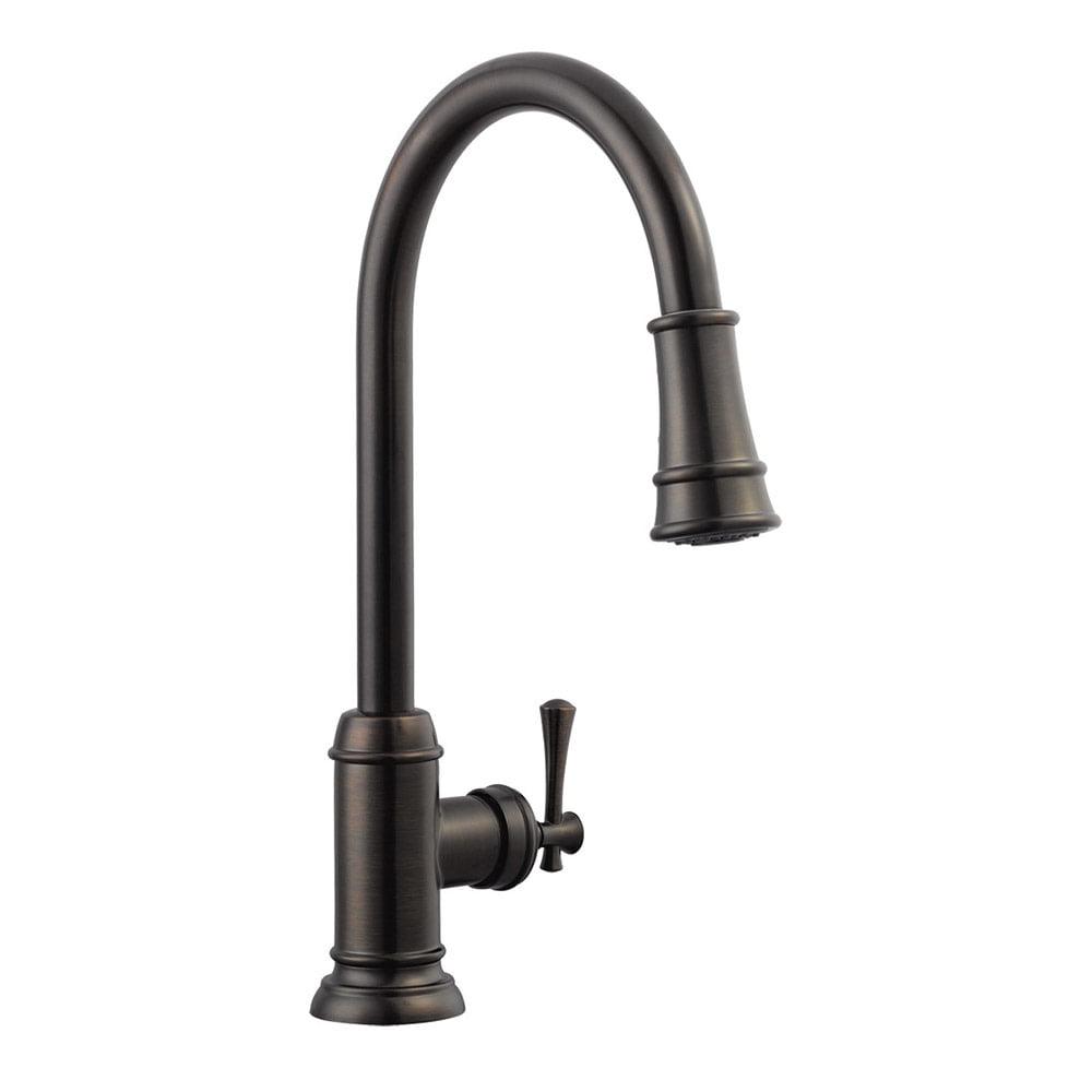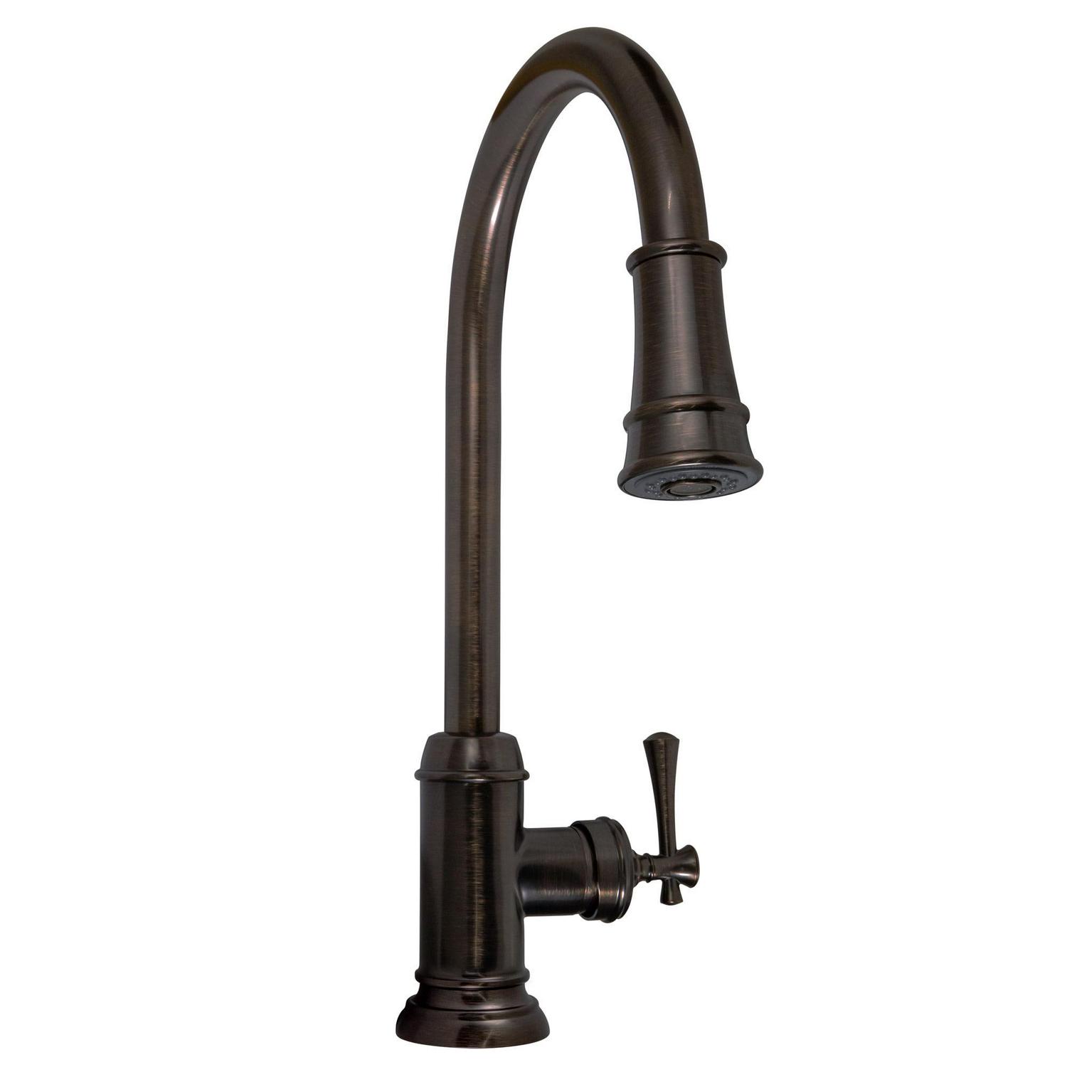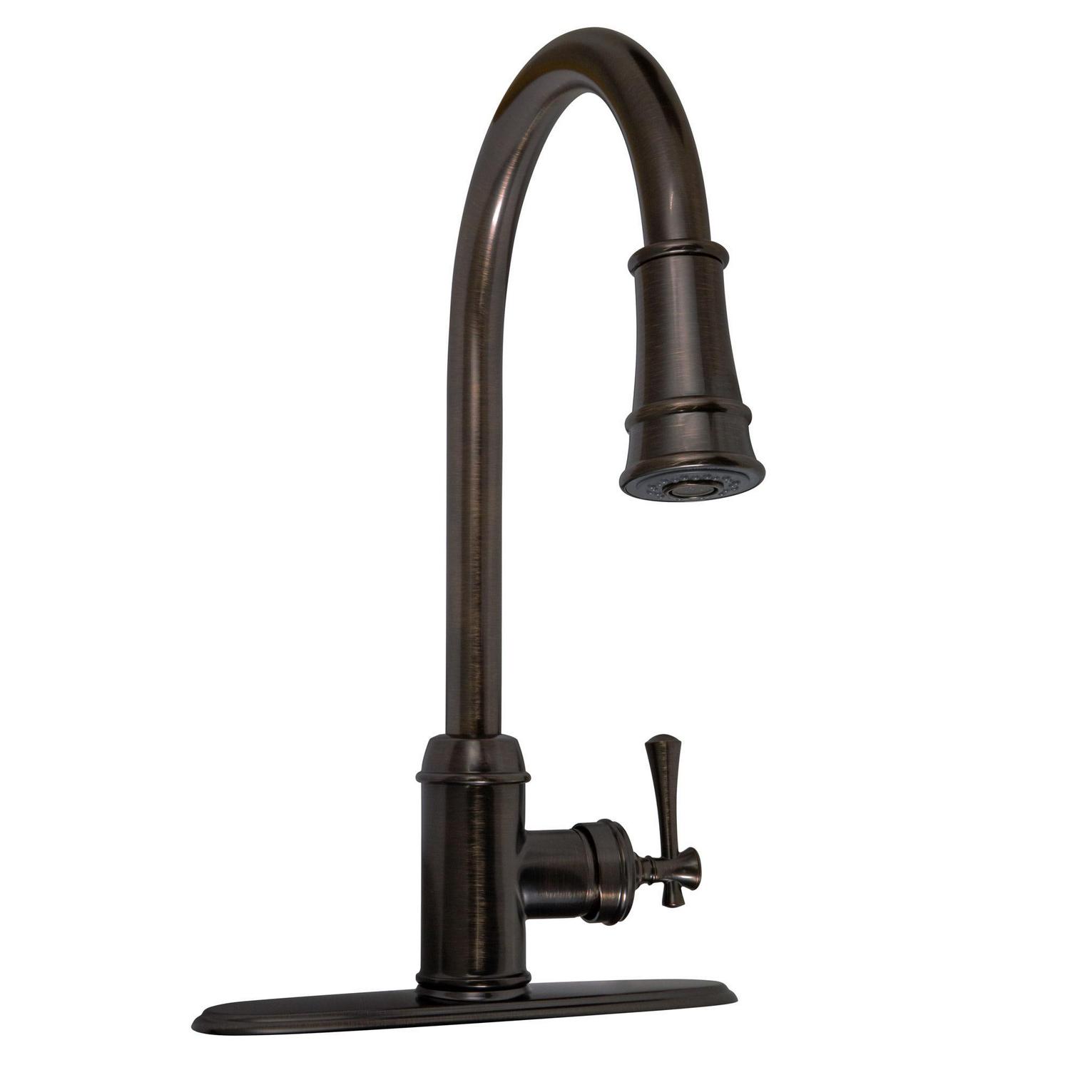 The Ironwood Kitchen Faucet with Pull-Down Sprayer features a brushed bronze finish, a 2-function pull out sprayer and a single handle design. Use the long-reaching sprayer head to eliminate baked on residue and rinse dishes and silverware clean of grime and food. This faucet accents kitchens and countertops with a simple well-built design. With brass waterways and a removable deck plate, this faucet is designed to endure the toughest conditions and is perfect for home remodeling projects. This product is perfect for remodeling your kitchen and matches painted cabinets and granite counter tops. Providing your home with clean drinkable water, this item produces 1.8-gallon per minute flow rate for a steady flow after years of everyday use. Wash dishes or fill pitchers with ease underneath this high vaulted faucet.This product comes with a 5-year and lifetime limited finish warranty