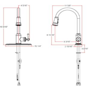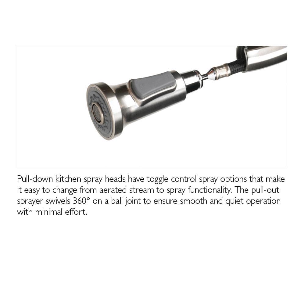 – Pull-down faucet head includes 2 toggle function for aerated stream or spray options and 59-inches of soft hose for targeted rinsing