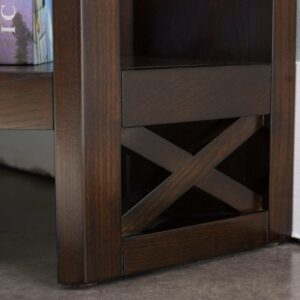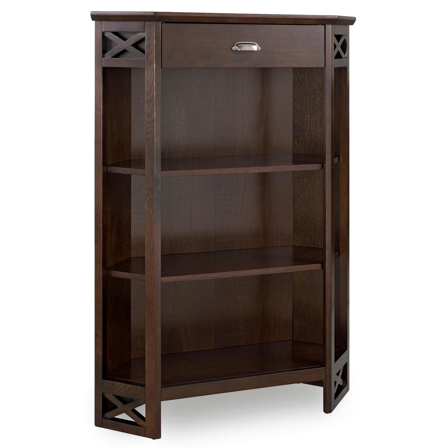 This Leick Home 81263 compact bookcase offers layers of furnishing possibilities–tucked away drawer storage, prominent mantel height top surface, and three adjustable shelves to hold anything that suits you. Add to that, a clever corner design settles back into the corner and reclaims valuable floor space. A rich, chocolate finish embellishes solid oak and oak veneers in this forward looking X design. The solid wood drawer box opens completely on ball-bearing roller guides for easy use.All Leick products are guaranteed against defects in workmanship for a period of one year under normal residential use. Please keep dated invoice for claims.