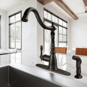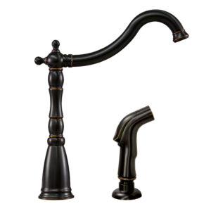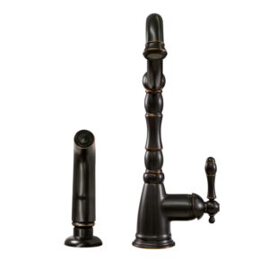 The Oakmont Kitchen Faucet with Sprayer features a single handle design with Victorian style. Use the matching side sprayer to eliminate baked on residue and rinse dishes and silverware clean of grime and food. With brass waterways and a removable deck plate, this faucet is designed to endure the toughest conditions and is perfect for home remodeling projects. Providing your home with clean drinkable water, this item produces 1.8-gallon per minute flow rate for a steady water flow for everyday use. Wash dishes or fill pitchers with ease underneath this high vaulted faucet.This product comes with a 5-year and lifetime limited finish warranty