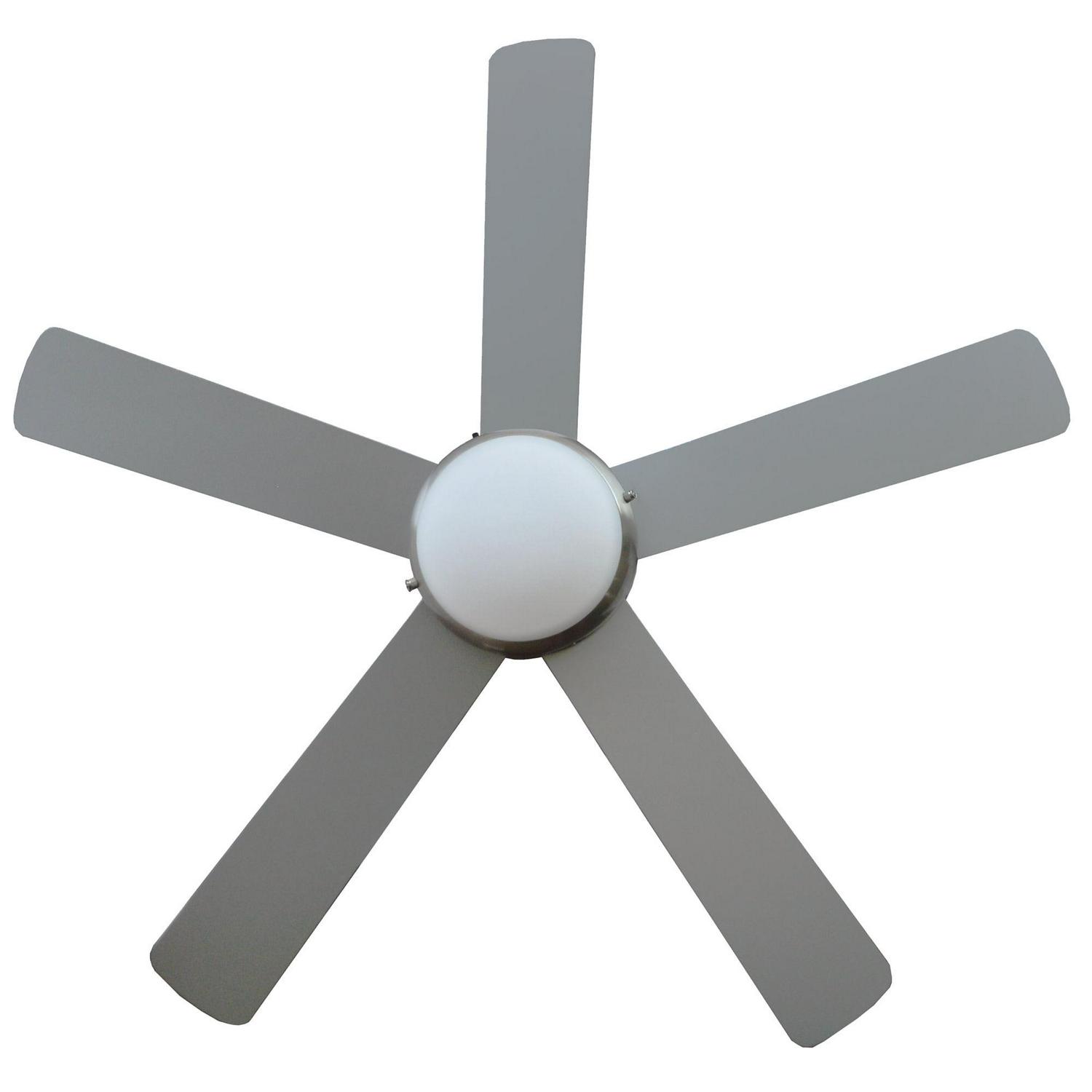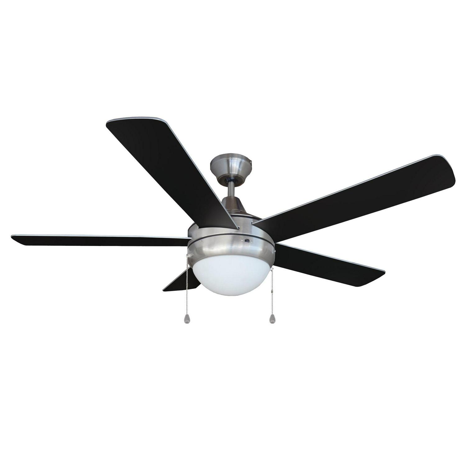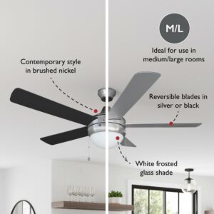 The Design House 156539-BN Sadie Ceiling Fan offers sleek design along with its ability to keep the air moving and light shining in any space in your home. Its contemporary styling showcases a steel fan body finished in brushed nickel and five flat-edged blades that can be installed to show either a neutral black or silver. The included LED light kit is housed in a sleek frosted glass, that is easy to clean. This fan centers any space, working well in dining room, kitchens and living areas alike. Designed and manufactured by Design House, the trusted source for quality lighting, hardware, plumbing, kitchen, and bath products for every taste and budget.ETL Listed for use in Dry spaces, DOE compliant