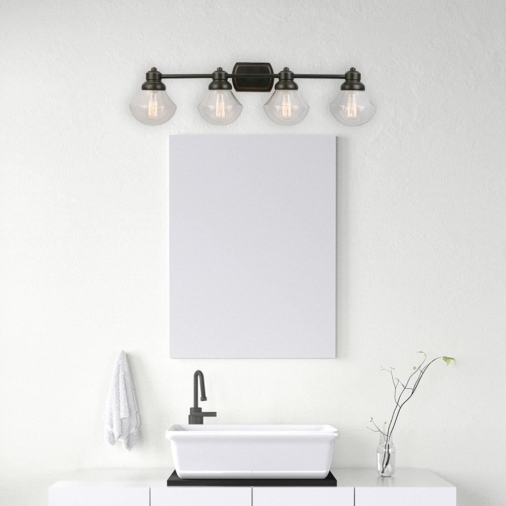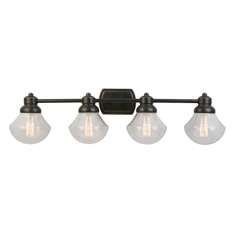 Create the ideal atmosphere for your daily routines with the Sawyer 4-Light Vanity Light. Crafted of formed steel, this fixture features softly curved, clear seedy glass shades and an oil rubbed bronze finish. Perfect for vintage, farmhouse, or rustic décor styles alike. Hang above your bathroom mirror or add some style to your hallways.UL listed for use in damp locations. The Sawyer Wall Light comes with a 10-Year limited warranty that protects against defects in materials and workmanship.