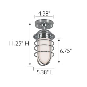 This Design House 588954-PC Seaton 1-Light Ceiling Light features a unique classic industrial and maritime design with a removable metal wire cage and white opal frosted glass. This wall light is rated for 120-volts and uses (1) 60W standard medium base bulb or LED equivalent (not included). Designed and manufactured by Design House, the trusted source for quality lighting, hardware, plumbing, kitchen, and bath products for every taste and budget.This product is UL listed for use in damp locations and comes with a 10-year limited warranty