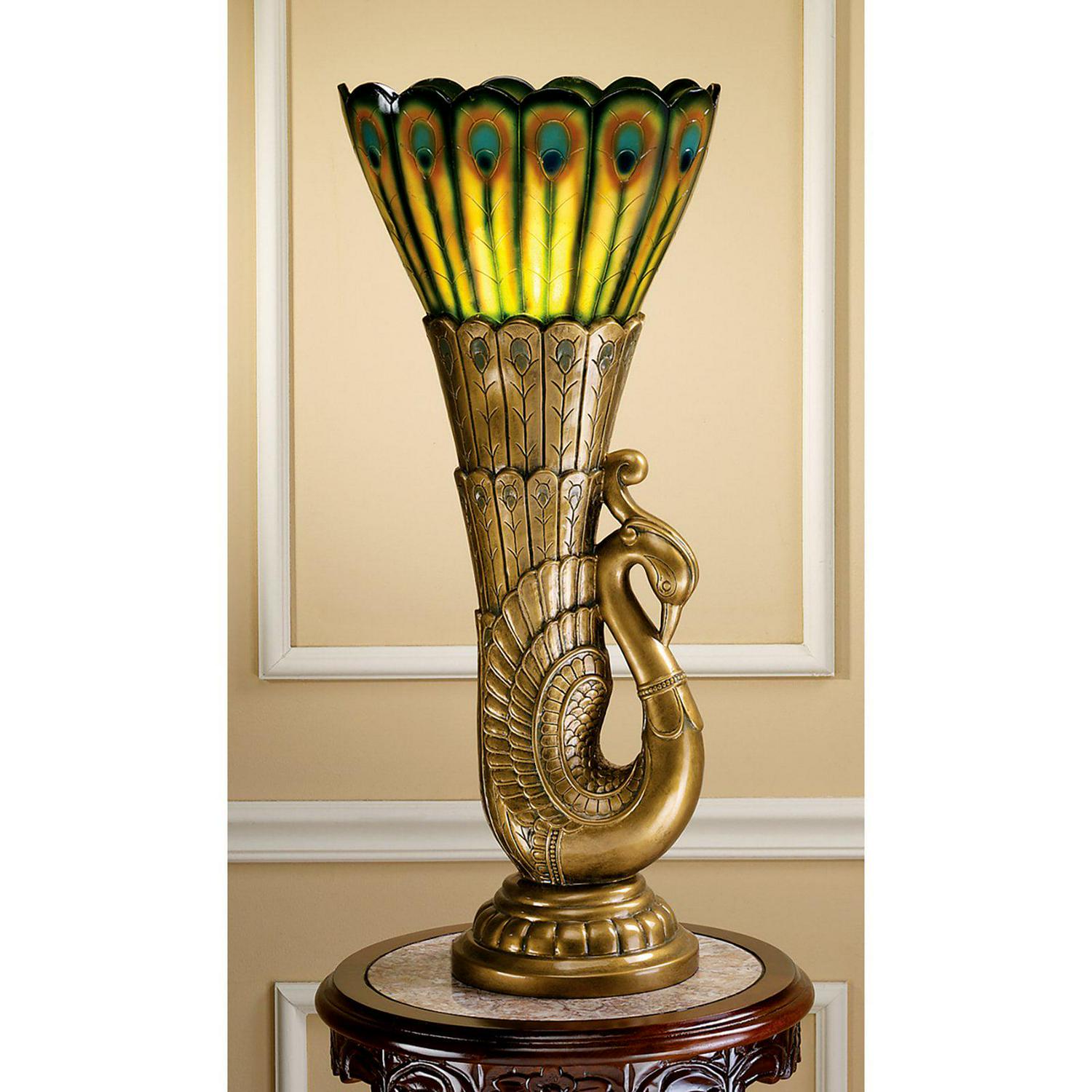 – Peacock plumage in a sparkling crystalline resin shade crowns this shimmering Art Deco style, Design Toscano-exclusive lamp that longs to take its proud place on console, mantle or boudoir dresser. Stylized feathers surround a breathtaking 360-degree sculpt cast in quality designer resin and finished in antique gold with a subtle, muted teal patina wash. Switch on cord; accepts your 60-watt bulb. 12.5″Wx8″Dx28.5″H. 13 lbs.